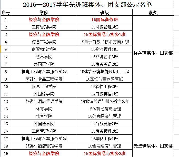 经过学院推荐、学校初审、公开展示、评审委员会评审,我院3个班级荣获“先进班级体、团支部”荣誉称号。其中15国际商务、15国际贸易实务1班被评选为“先进班级体、团支部(标兵)”,分别居全校第一名和第三名;15国际贸易实务2班被评选为“先进班级体、团支部”。
