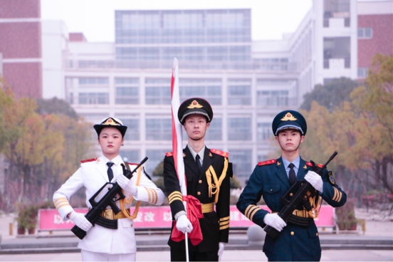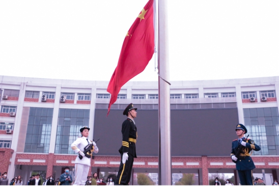 升旗仪式开始,五星红旗庄严入场,雄壮有力的《义勇军进行曲》响彻校园,全体学生行注目礼,庄严肃穆。