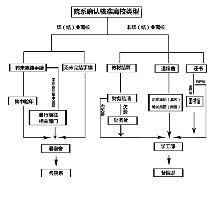 第八条 学生应在毕业典礼前确认教材费、学费、住宿费等相关费用已结清、图书借还手续已办理完。以上手续未完结的学生由各院系辅导员通知其参加集中验印,因故不能参加集中验印的学生可在毕业离校前自行前往各相关部门办理离校手续。