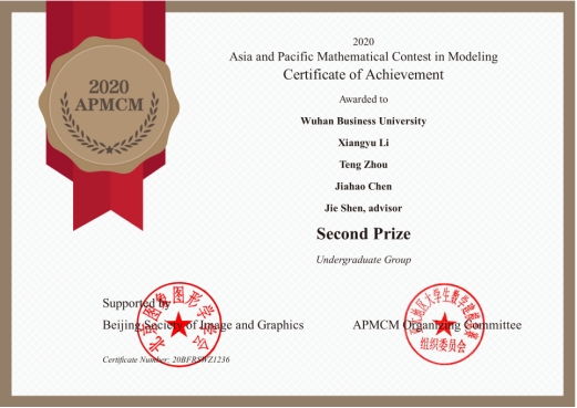 热烈祝贺437必赢会员中心2019级商务经济学1班李翔宇学生团队获2020-2021亚太地区(APMCM)数学建模比赛二等奖。