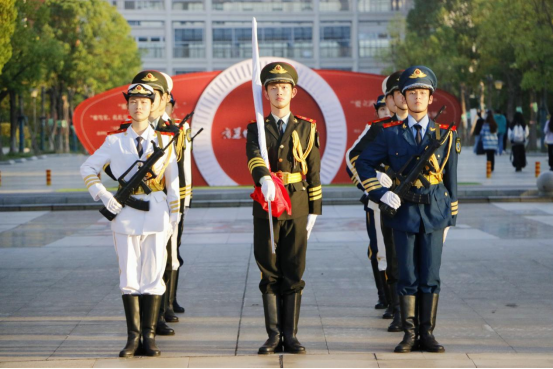 伴随着雄壮有力的《义勇军进行曲》,升旗仪式正式开始,护旗手护送五星红旗庄严入场,全体学生齐唱国歌、行注目礼,庄严肃穆的气息弥漫全场。