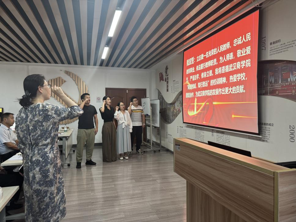 首先进行的是新进教师入职宣誓仪式。在学院师德楷模、资深教师万涛老师的带领下,新进教师举起右拳,庄严宣誓,表达了新教师们恪守师德规范、践行育人使命、献身教育事业的坚定决心。这一仪式不仅增强了新教师的职业荣誉感、责任感和归属感,更是一次深刻的精神洗礼,为他们的教学生涯奠定了崇高的起点。