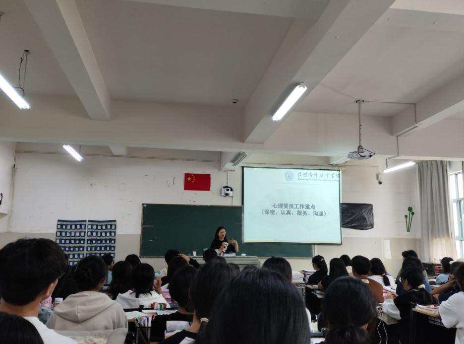 为了提高心理委员对心理健康的认知,更好地宣传心理健康知识,2023年9月27日下午16:00,心理咨询科周睿媛老师与郭正梅老师在1教202教室对新生班级心理委员展开了培训活动。
