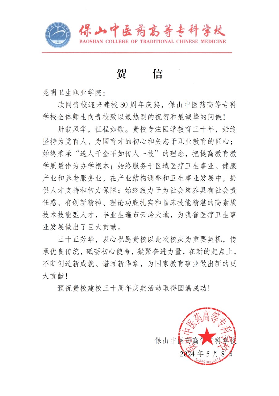 保山中医药高等专科学校致beat365平台官方网站建校30周年庆典贺信