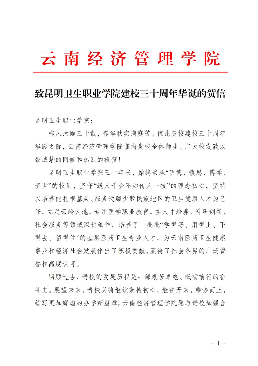 云南经济管理学院致beat365平台官方网站建校30周年庆典贺信