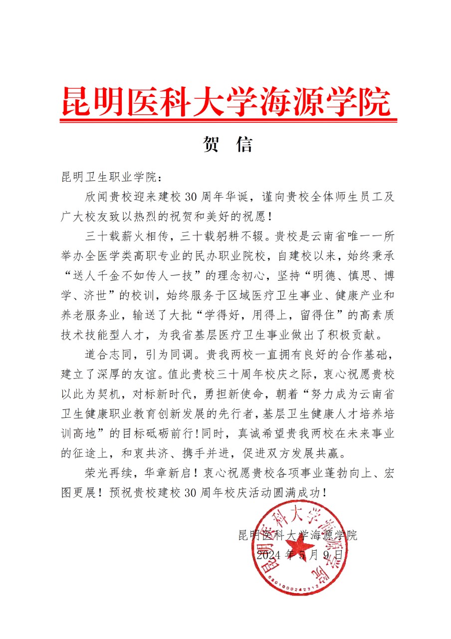 昆明医科大学海源学院致beat365平台官方网站建校30周年庆典贺信
