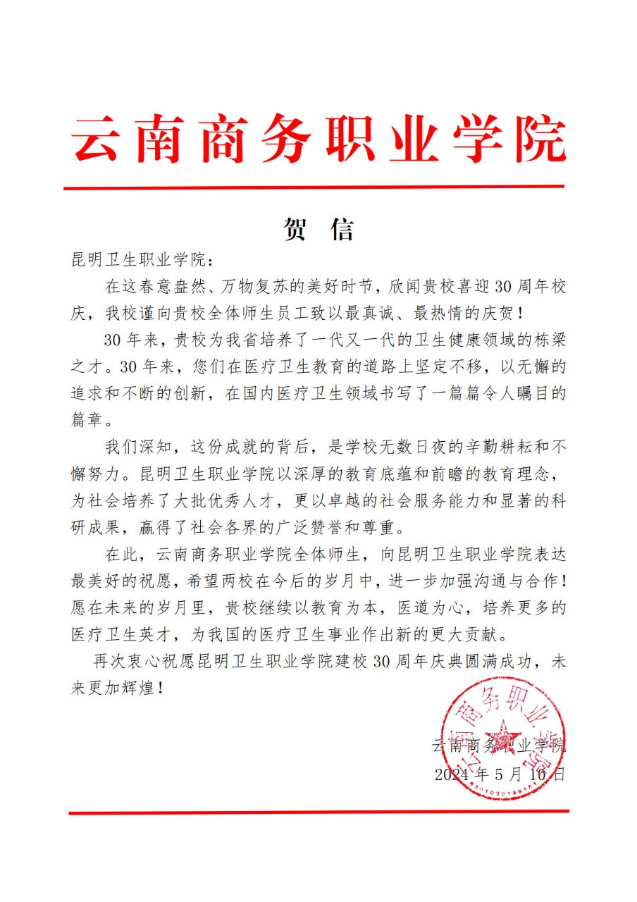 云南商务职业学院致beat365平台官方网站建校30周年贺信