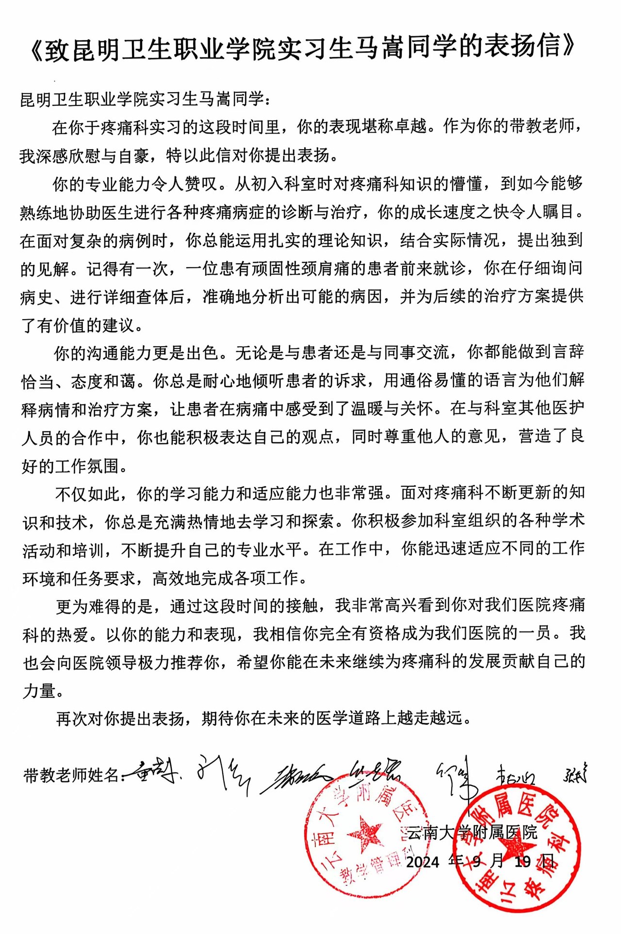 信中写到,马嵩同学在实习期间不仅专业能力强,能够熟练地协助医生进行各种疼痛病症的诊断与治疗,实践操作能力得到了医护人员的认可,也赢得了患者和家属的信赖;而且沟通能力出色,无论是与患者还是与同事交流,你都能做到言辞恰当、态度和蔼;还有非常强的学习能力和适应能力,面对不断更新的知识和技术,总是充满热情地去学习和探索,不断提升自己的专业水平,迅速适应不同的工作环境和任务要求,高效地完成各项工作。