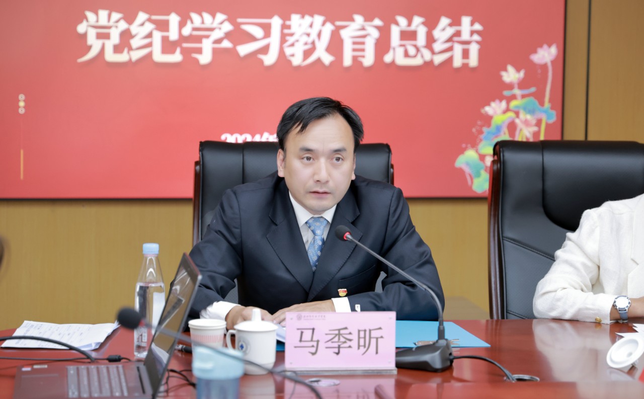 马季昕书记作总结讲话,全面总结了学院2024年党纪学习教育开展情况和实际成效,对持续巩固深化党纪学习教育成果,推动党的建设上水平,落实党纪学习教育常态化长效化提出三点要求。一是要常学常新,推进党纪学习教育常态化制度化。将党章党规党纪的学习教育常态化,是加强党的建设的重要任务,各基层党组织要建立经常性和集中性相结合的纪律教育机制,统筹抓好后续学习安排,使铁的纪律转化为党员、干部的日常习惯和自觉遵循,保障学院各项改革任务顺利推进;二是要常思常悟,推进党纪学习教育成果转化升华。要引导党员干部继续深入学习党章党规党纪,将党纪学习成果运用到实际工作中,发挥先锋模范作用;三是要常照常省,推动全体党员时常揽镜自照鉴镜自省。要深入学习贯彻习近平总书记关于全面加强党的纪律建设的重要论述,坚持开展警示教育、反面典型案例教育活动,把学习贯彻《条例》等党规党纪情况作为民主生活会和组织生活会对照检查的重要内容,引导全体党员常敲思想警钟、常紧纪律之弦、常存敬畏之心,不断提高党性修养和拒腐防变能力,提升教师队伍的整体素质,推动学院高质量发展。