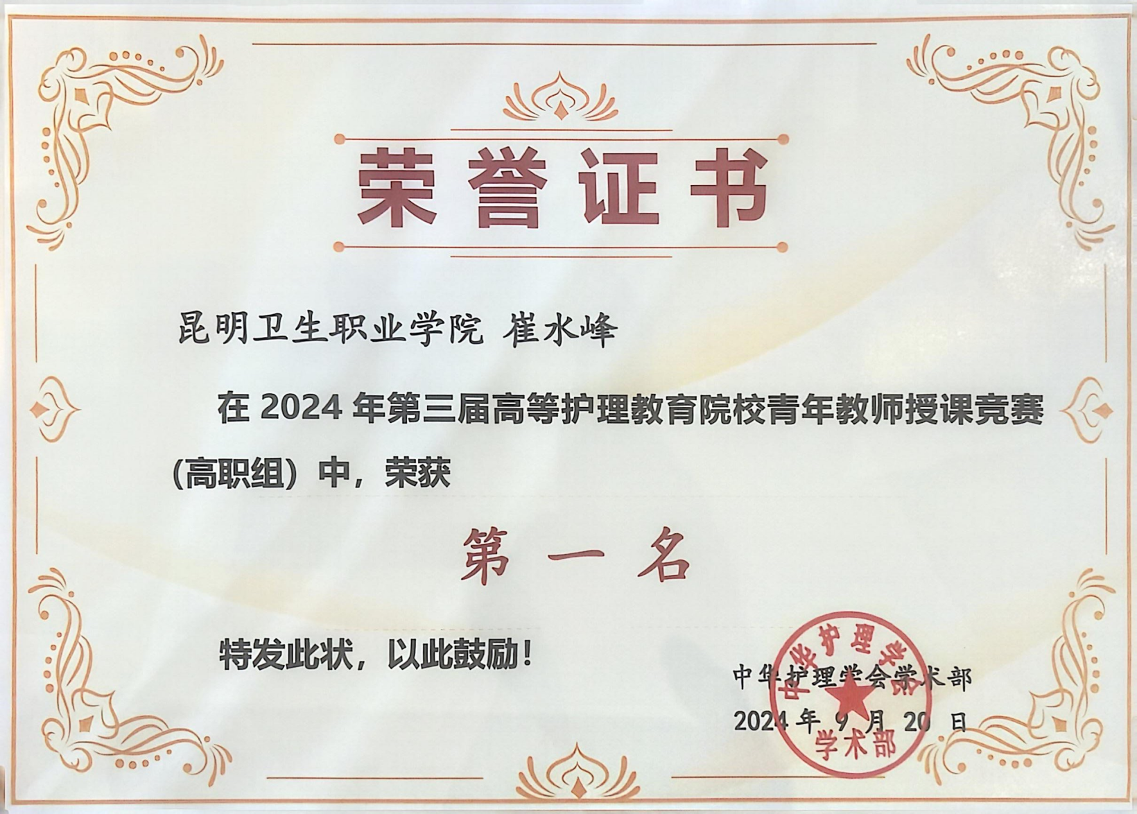 全国高等护理教育院校青年教师授课竞赛是重要的参赛平台。本次竞赛共有106所本科院校及63所高职院校参加,169名参赛护理教师以饱满的热情、清晰的教学思路和生动的讲解,将复杂的护理知识深入浅出地传授给学生和评委,呈现出一堂堂生动精彩的护理课程,充分展现了参赛教师的专业素养和教学风采。崔水峰老师在本次竞赛中的优异表现,充分展现了学院护理教师队伍在教学上精益求精、不断提高自身的能力和水平的精神风貌。