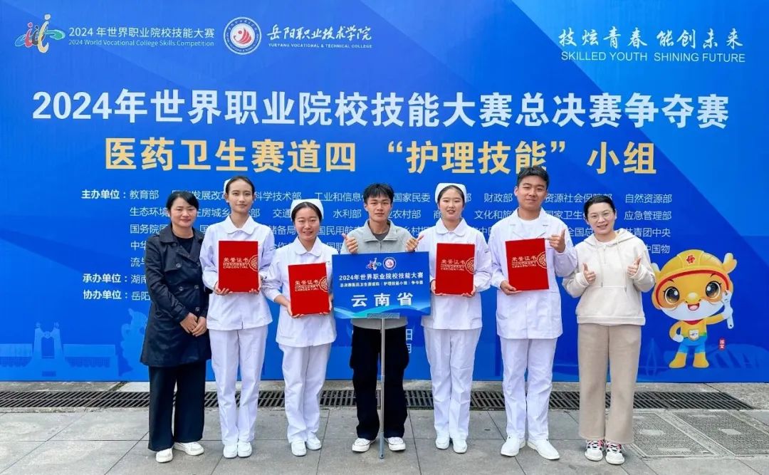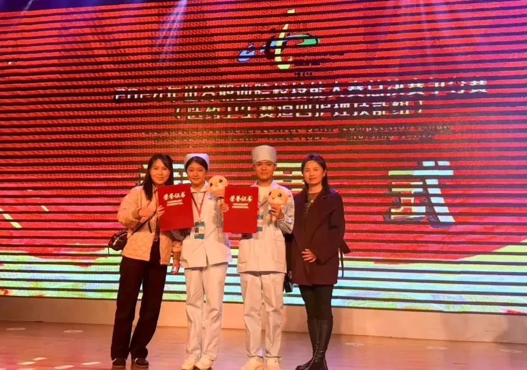 2022级高职护理6班段正坤、护理14班李雯琪、2023级高职护理5班刘媛,护理专业董廷轩及标准化病人(SP)来自2023级高职护理6班的杨银荣在指导教师李云飞、戚蓉精心指导下,稳定发挥、充分展示了所学的理论知识和操作技能,勇夺该赛项高职组铜牌。