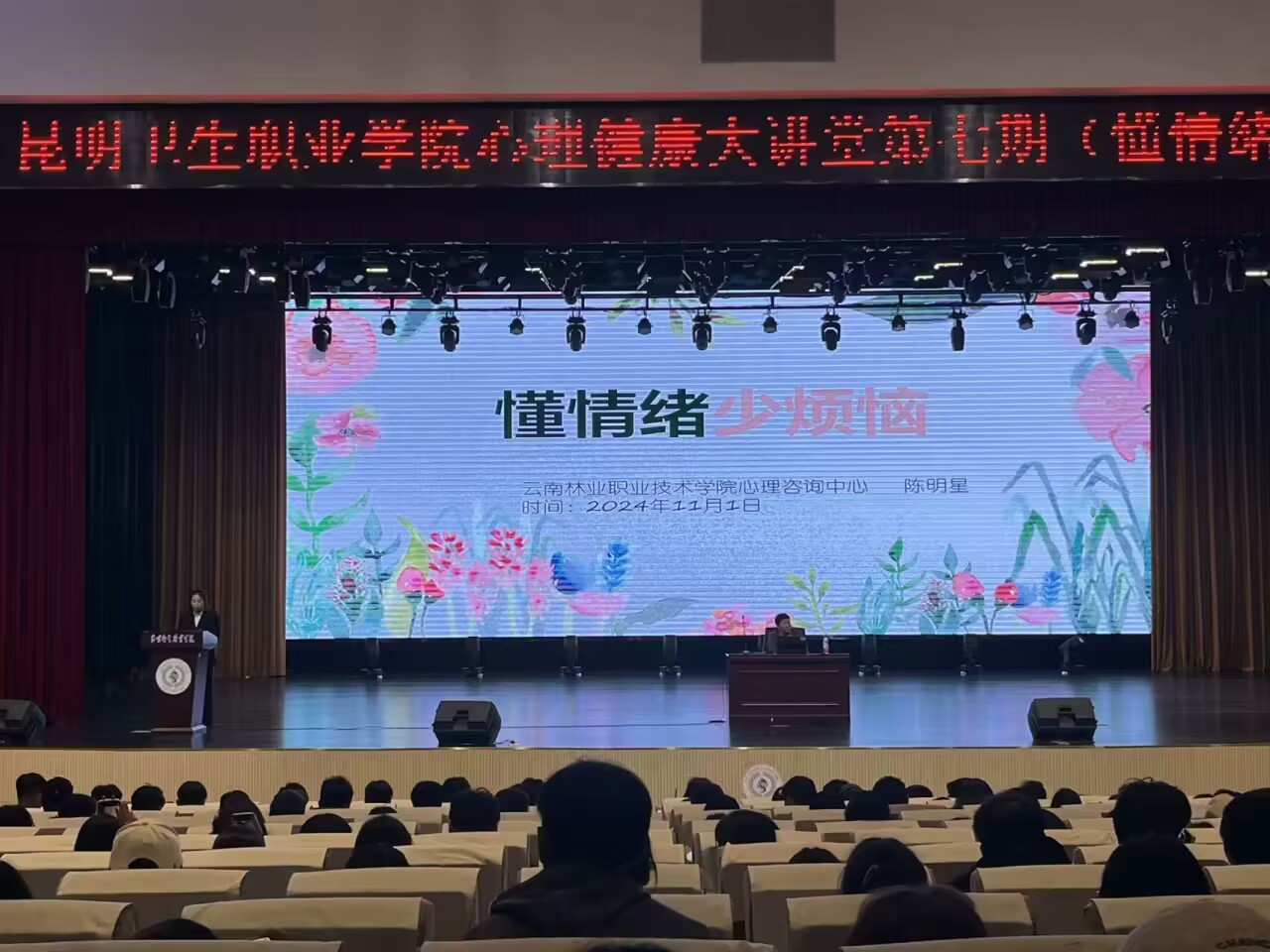 2024年11月1日下午,beat365大学生工作部心理咨询科在明德会堂举办了第七期心理健康大讲堂,主题为《懂情绪,少烦恼》,本次讲座邀请了云南林业职业技术学院心理咨询中心陈明星教授。讲座主要面向beat36524级新生,希望通过这次讲座的举办能让同学们更加懂得自己的情绪,减少情绪烦恼。