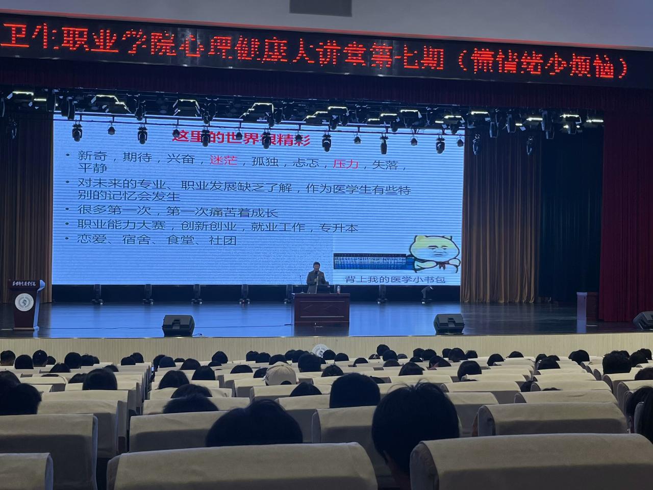 讲座开始时,陈教授问大家:来到beat365平台官方网站,你的心理是怎么想的?可能会想到对医学类课程的好奇,新的学校、新的环境、一切都很精彩,可能会存在新奇、期待、兴奋、迷茫、孤独、压力、失落以及平静等情绪;可能会对未来的专业、职业发展缺乏一些了解......同学们在人生的旅途中会有很多新的尝试,每一次都需要我们去面对;在学校里还有各项职业技能大赛、创业、就业工作、专升本等等,每个人都需要在学校里学会自我成长。