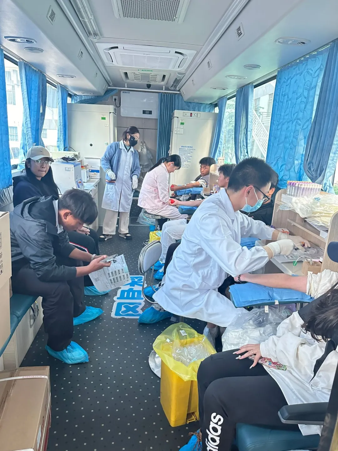活动期间,校园内爱心涌动,秩序井然。采血车一早就位,献血师生们满怀热忱,依次排队完成登记、体检、初筛等环节,现场气氛热烈而温馨。学院的志愿者们成为了活动中一道亮丽的风景线,他们忙碌地穿梭在人群中,耐心解答疑问,协助填写表格,为献血者提供贴心的引导和帮助,并细心叮嘱献血后的注意事项,用实际行动践行 “全心全意为师生服务” 的宗旨。