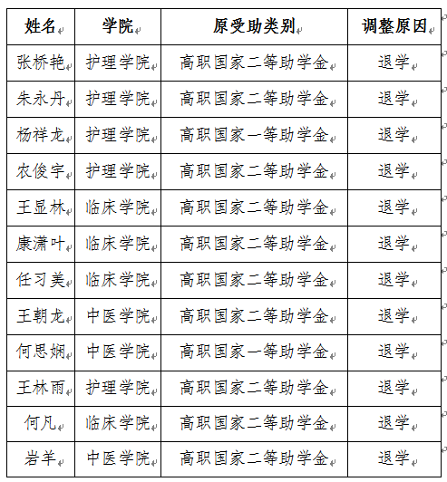 高职国家助学金:经二级学院核实受助学生名单,结合全国学生资助系统更新的重点保障人群数据,经学生主动申请、二级学院审核、资助中心核实确认,现共计12名受助学生因学籍变动不再符合高职国家助学金受助条件。现将受助资格收回,重新分配至其他12名符合资助条件且家庭经济困难的学生。