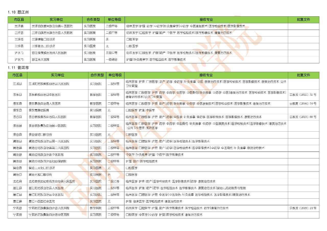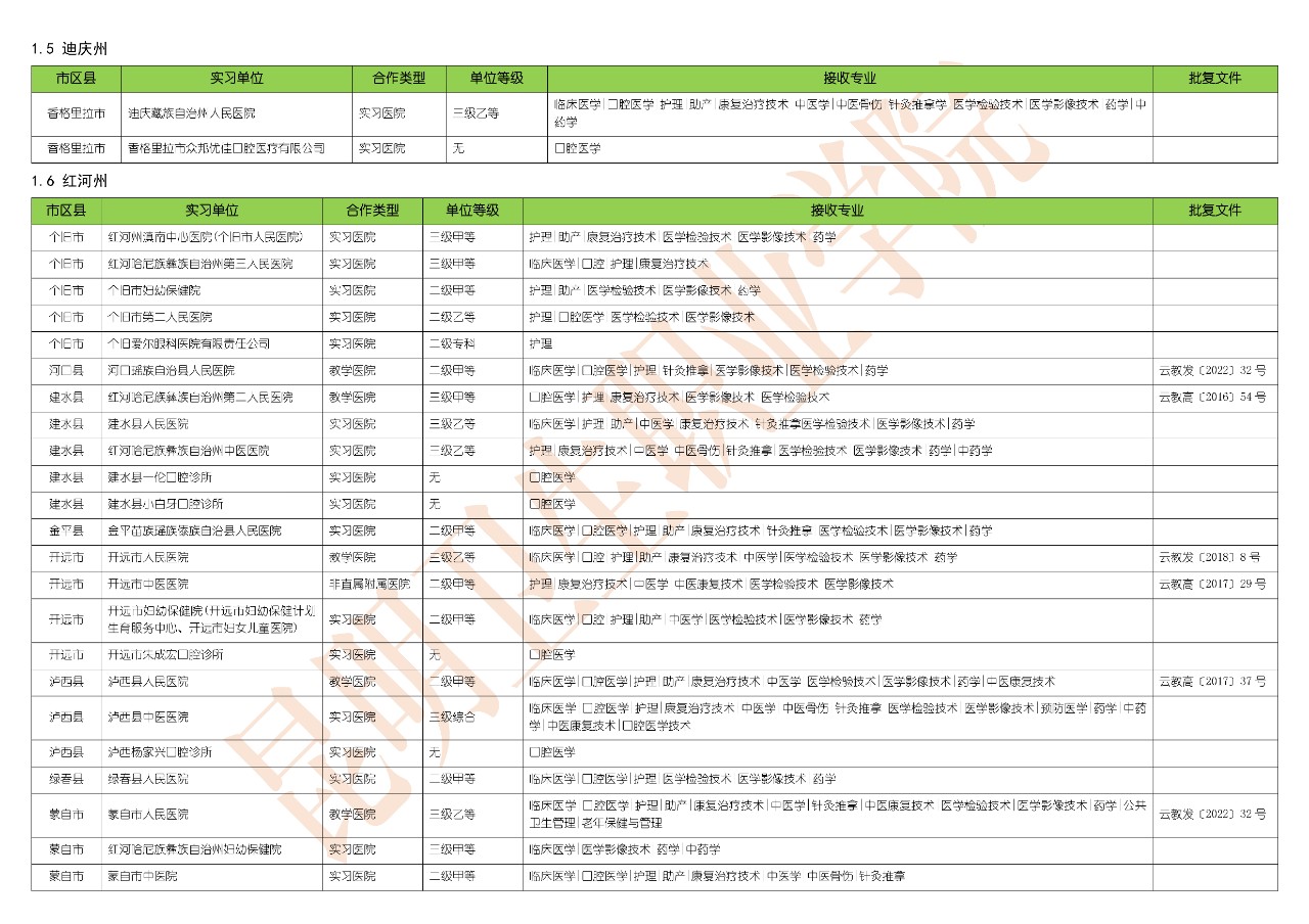 学院实习基地布局以云南省为核心,辐射西部省份,构建了“综合医院+专科连锁+基层社区+医药企业”的多层次网络,既保障学生实践资源,也助力区域医疗协同发展。从地域覆盖来看,在云南省下辖的 16 个州市中,学院的合作单位占比超过 96%,实现了省内广泛布局。同时,合作范围还拓展至广西、四川、贵州、福建、江苏等省外地区。从合作类型细分,学院拥有直属附属医院 4 所、非直属附属医院9所、教学医院 48 所、实习医院395所、实习企业12家;从医院等级来分,三级医院81家(含三级甲等医院 48家),二级医院185家(含二级甲等医院153家、二级综合17家、二级专科8家、二级乙等7家);一级医院4家(基层社区卫生服务中心、地州民营医院);无等级的疾病预防控制中心、口腔专业特色单位药企198家。就占比而言,综合医院占比约51.9%,专科医院占比约43.3%,基层卫生机构占比约2.3%,医药企业等占比约2.5%。