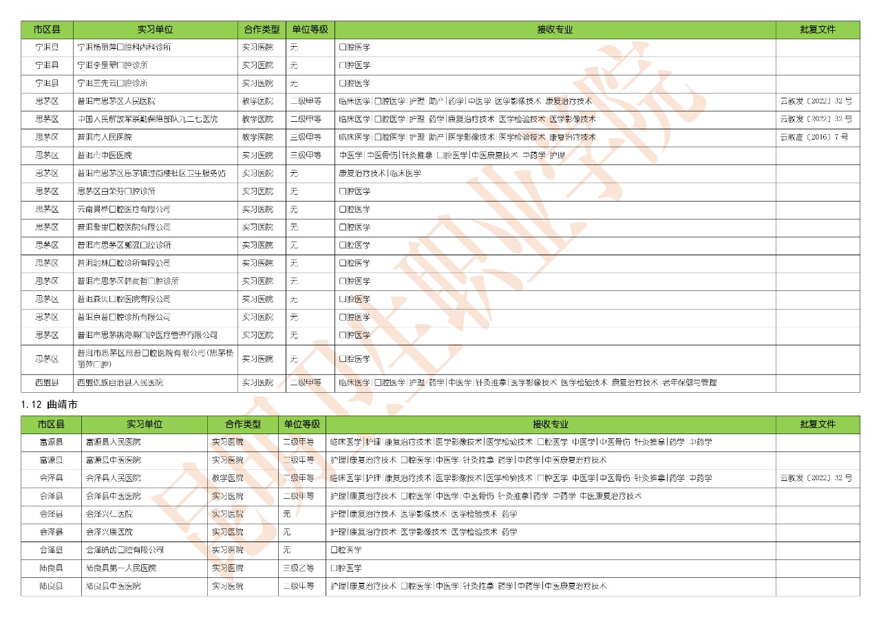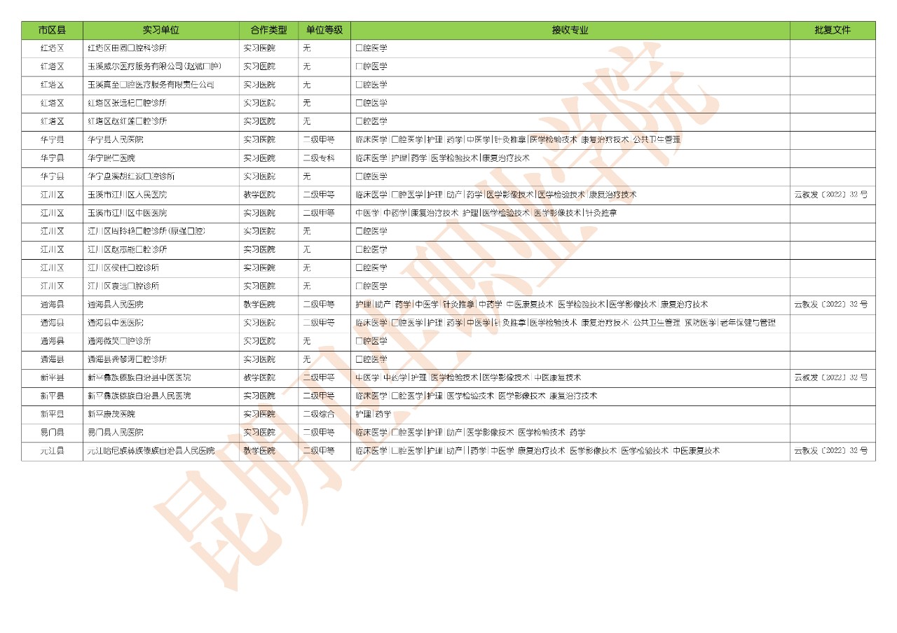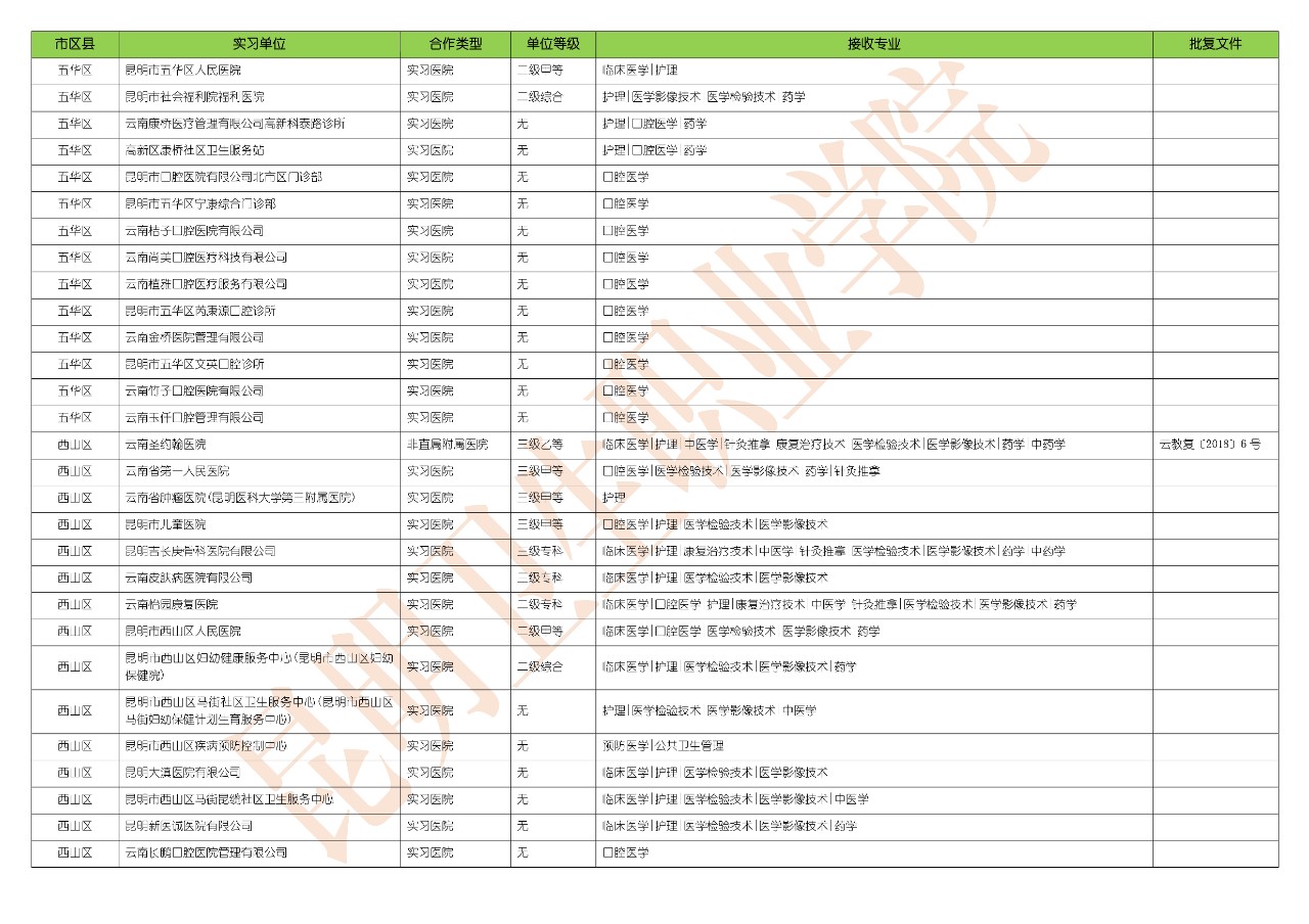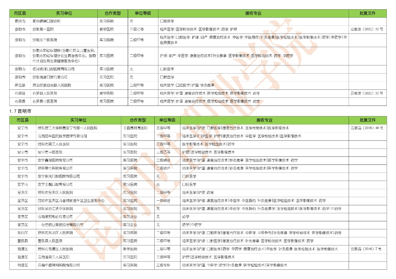 现对外公布校外实习基地的相关信息,公示时间长期有效,鉴于实习基地每年接收实习学生的专业和人数动态变化,实际可选择的实习单位及接收专业和人数,请以“智汇昆卫”系统中实习单位选择板块所公布的信息为准。如有异议,请直接与临床实践教学管理科反映。