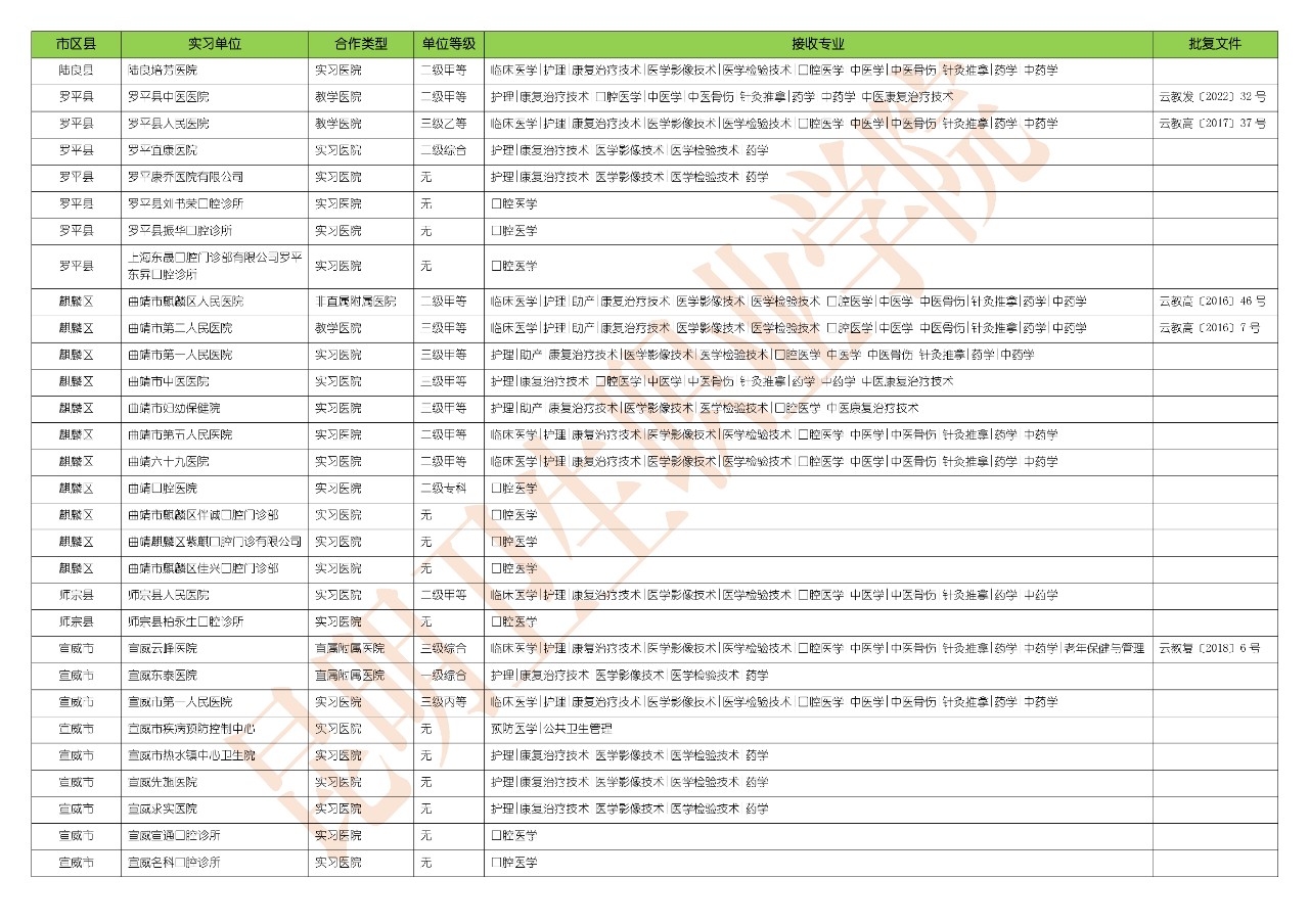这些实习单位所提供的实习岗位,全方位覆盖学院目前开设的药品质量与安全、临床医学、口腔医学、护理、助产、药学、中医学、中医骨伤、针灸推拿、中药学、中医康复技术、医学检验技术、医学影像技术、口腔医学技术、卫生检验与检疫专业、康复治疗技术、公共卫生管理、预防医学、婴幼儿托育服务与管理、老年保健与管理20个专业,为学生提供了广阔且适配的实践平台。