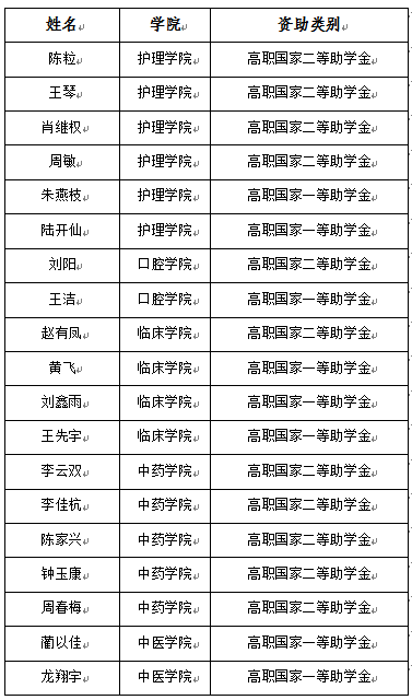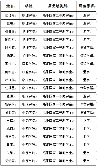 高职国家助学金:经二级学院核实受助学生名单,结合全国学生资助系统更新的重点保障人群数据,经学生申请,二级学院审核,学籍科、资助中心核实确认,现共计19名受助学生因学籍异动不再符合高职国家助学金受助条件。现将受助资格收回,重新分配至其他19名符合资助条件且家庭经济困难的学生。