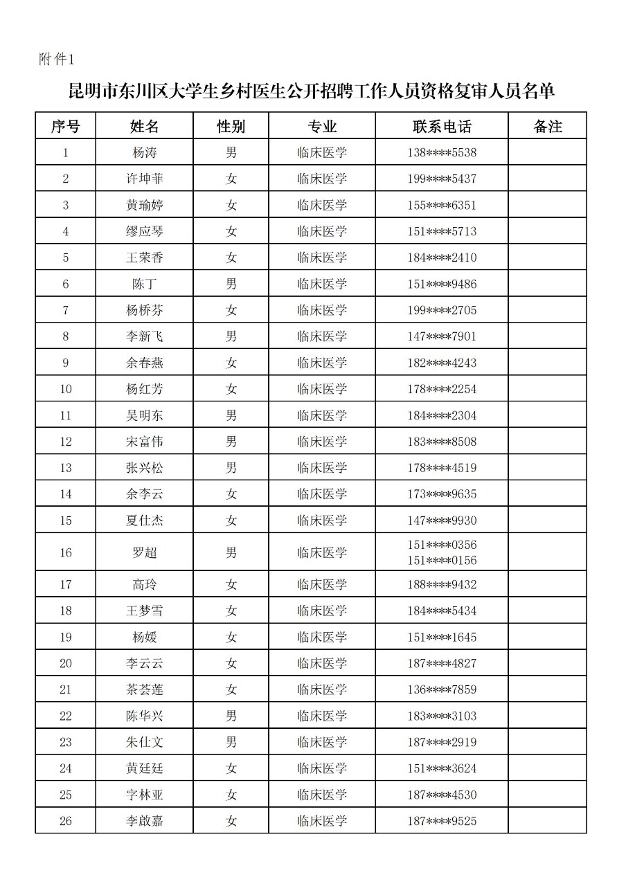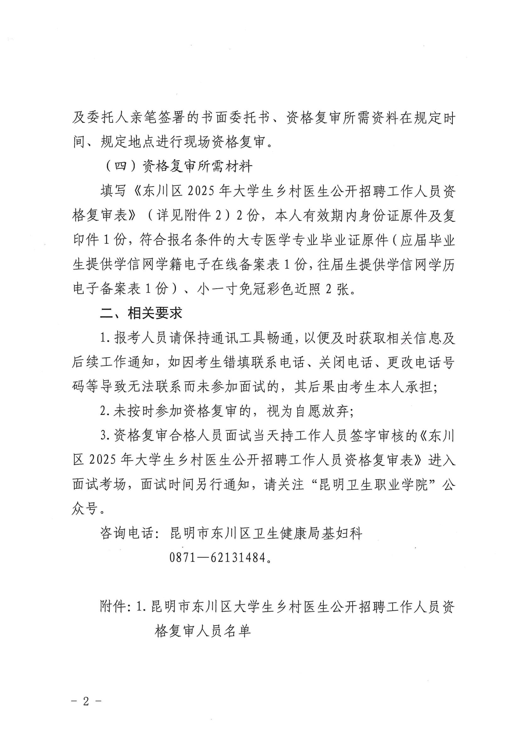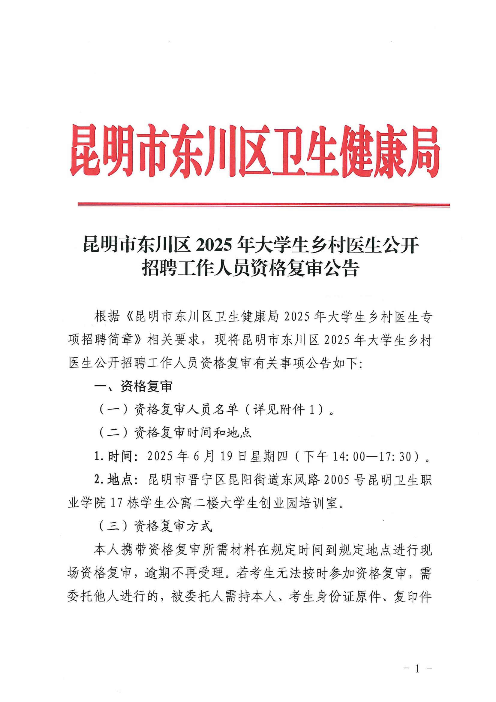 昆明市东川区2025年大学生乡村医生公开招聘工作人员资格复审公告