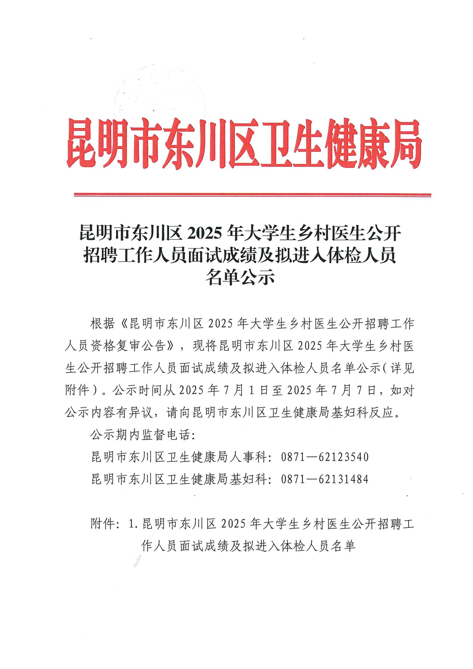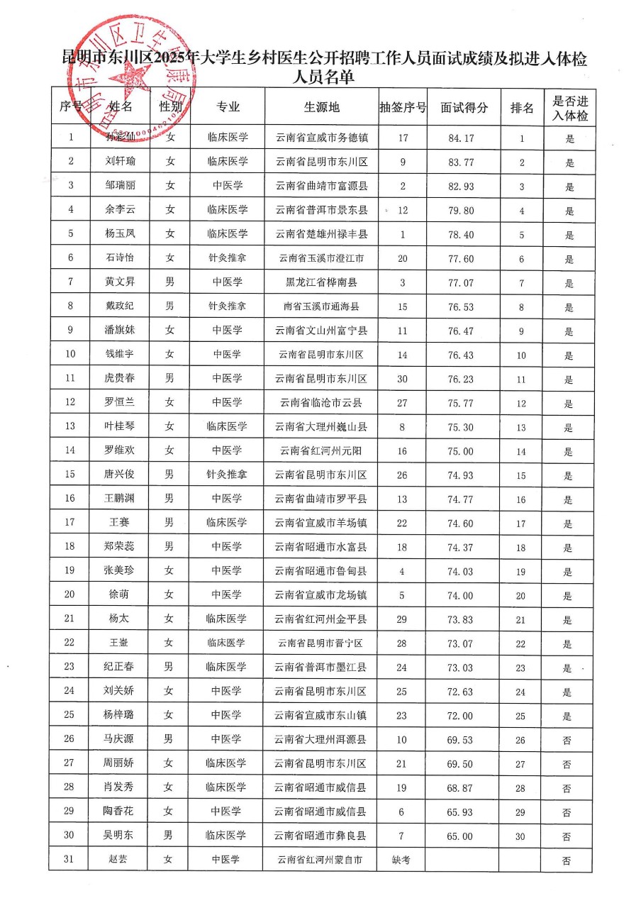 昆明市东川区2025年大学生乡村医生公开招聘工作人员面试成绩及拟进入体检人员名单公示