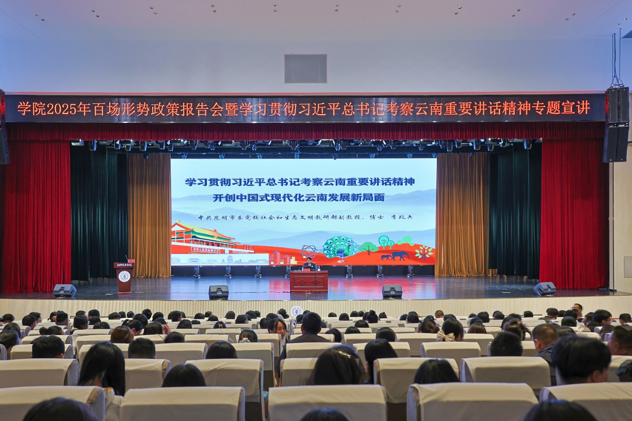 为深入学习贯彻习近平总书记考察云南重要讲话精神和省委十一届八次全会精神,推动学院师生将思想行动统一到国家战略与区域发展需求上来,6月4日,学院举办2025年春季学期形势政策报告会暨学习贯彻习近平总书记考察云南重要讲话精神专题宣讲会。本次会议特邀昆明市委党校副教授李玟兵进行深度解读与交流,四百余名师生代表现场聆听了讲座,会议由学院党委委员、宣传统战部部长王斌主持。