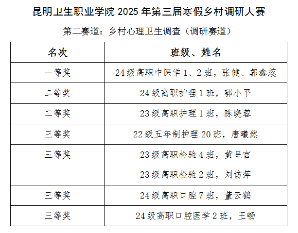 为深入学习贯彻习近平新时代中国特色社会主义思想,积极响应党的二十大精神,引导青年学生在社会实践中锤炼思想、锻炼成长,心理咨询科于2025年寒假期间成功举办了“第三届寒假返乡调研报告征集大赛”。本次活动以乡村心理健康为主题,设置了家校心理联动与乡村心理卫生调查两大赛道,吸引了全校同学的广泛参与,涌现出一批高质量的调研作品。此次获奖同学名单如下: