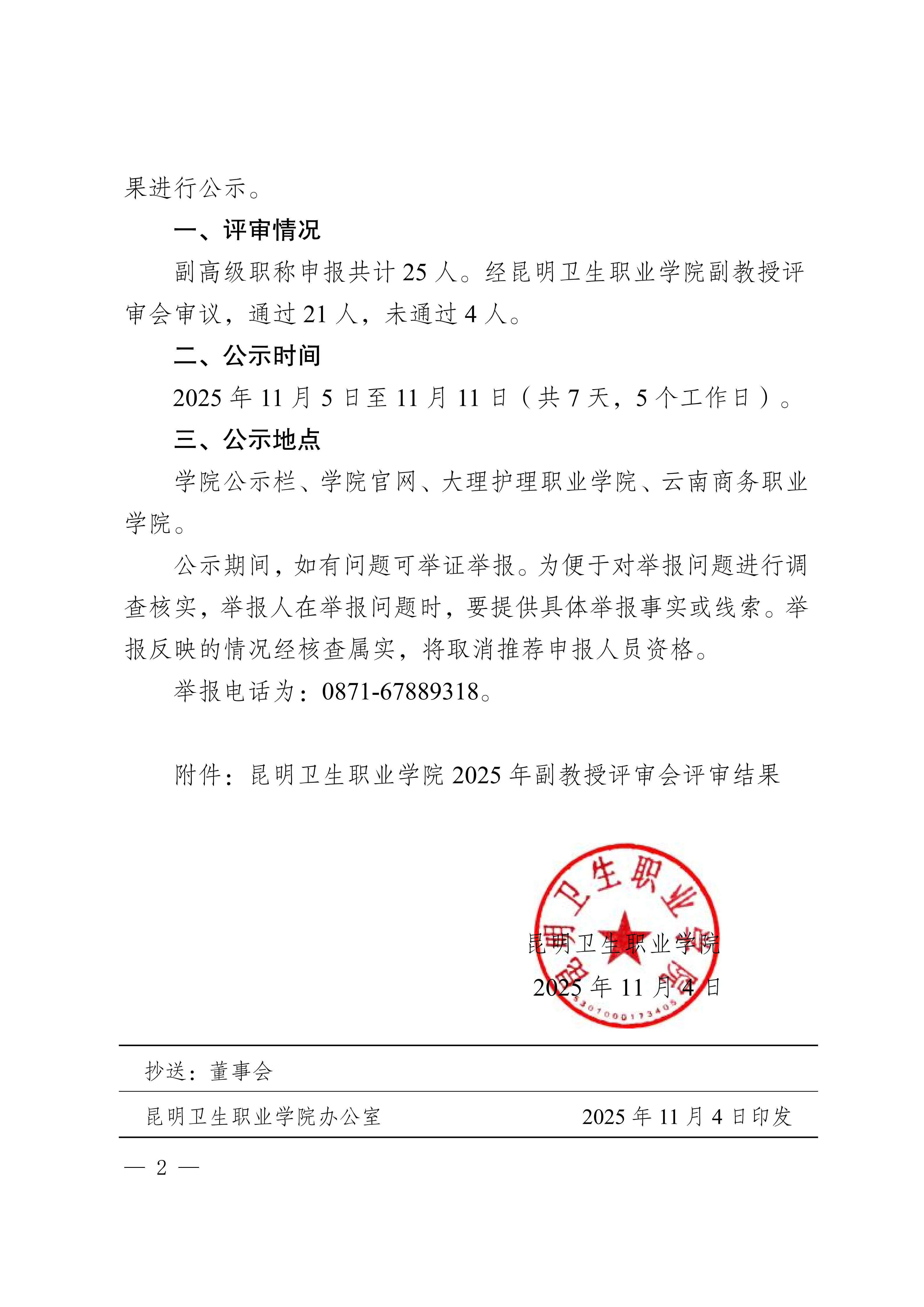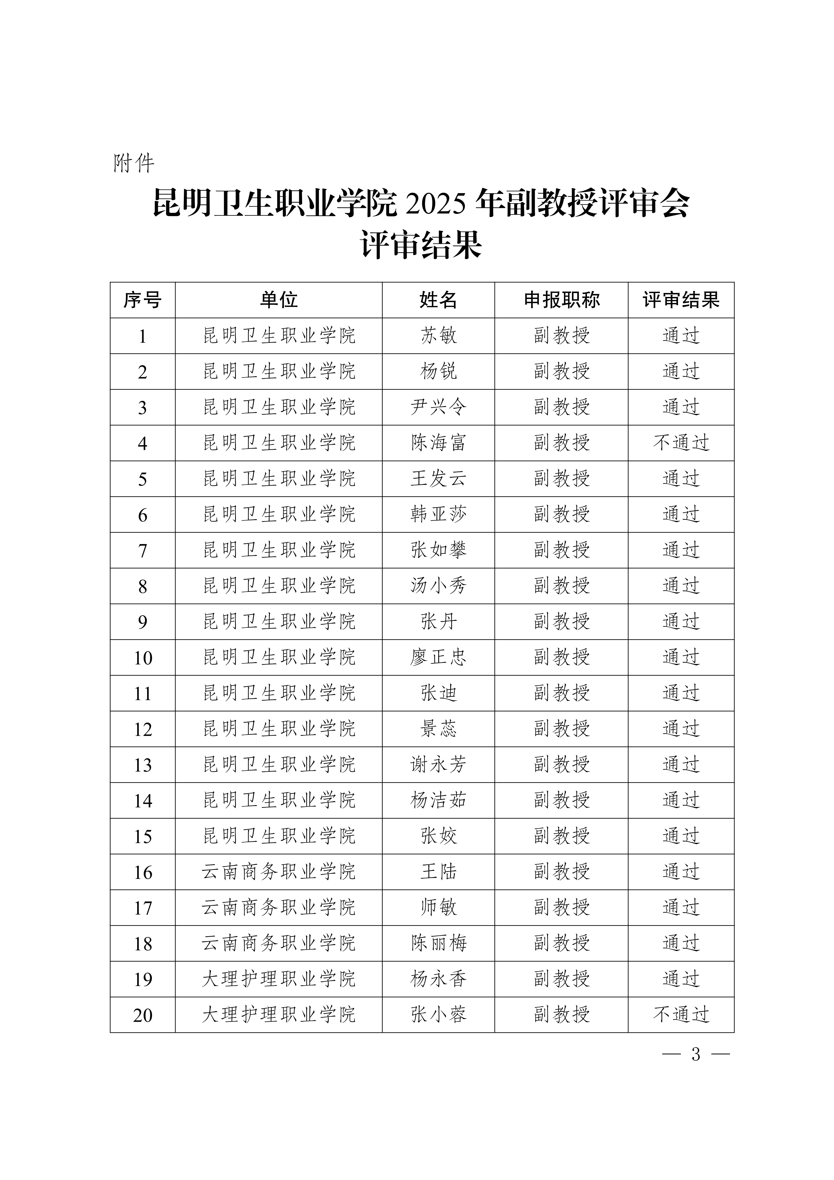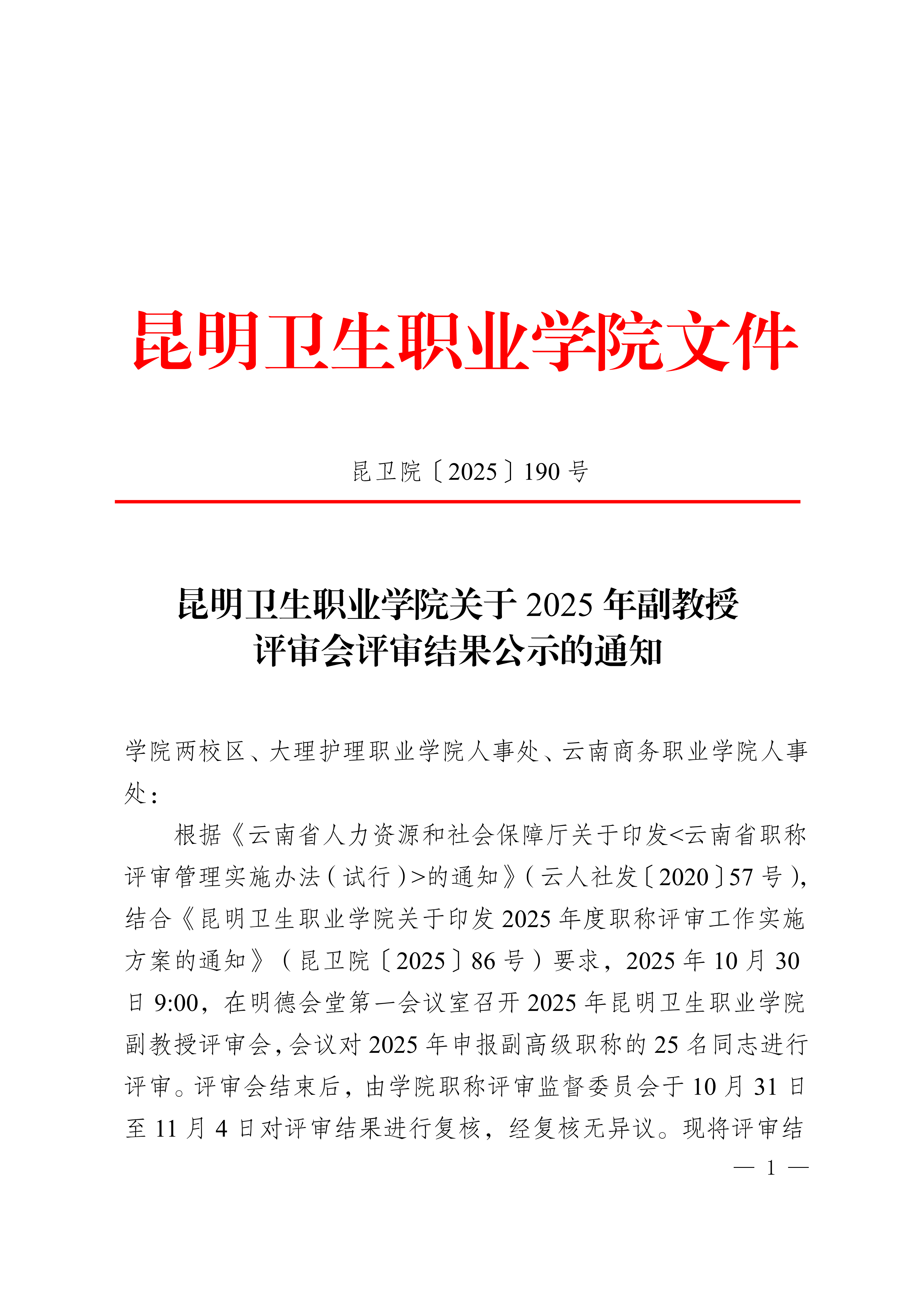 昆卫院〔2025〕190号 beat365平台官方网站关于2025年副教授评审会评审结果公示的通知