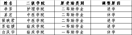 高职国家助学金:经二级学院核实受助学生名单,学籍科、资助中心核实确认,现共计5名受助学生因学籍异动不再符合高职国家助学金受助条件,现将受助资格收回。