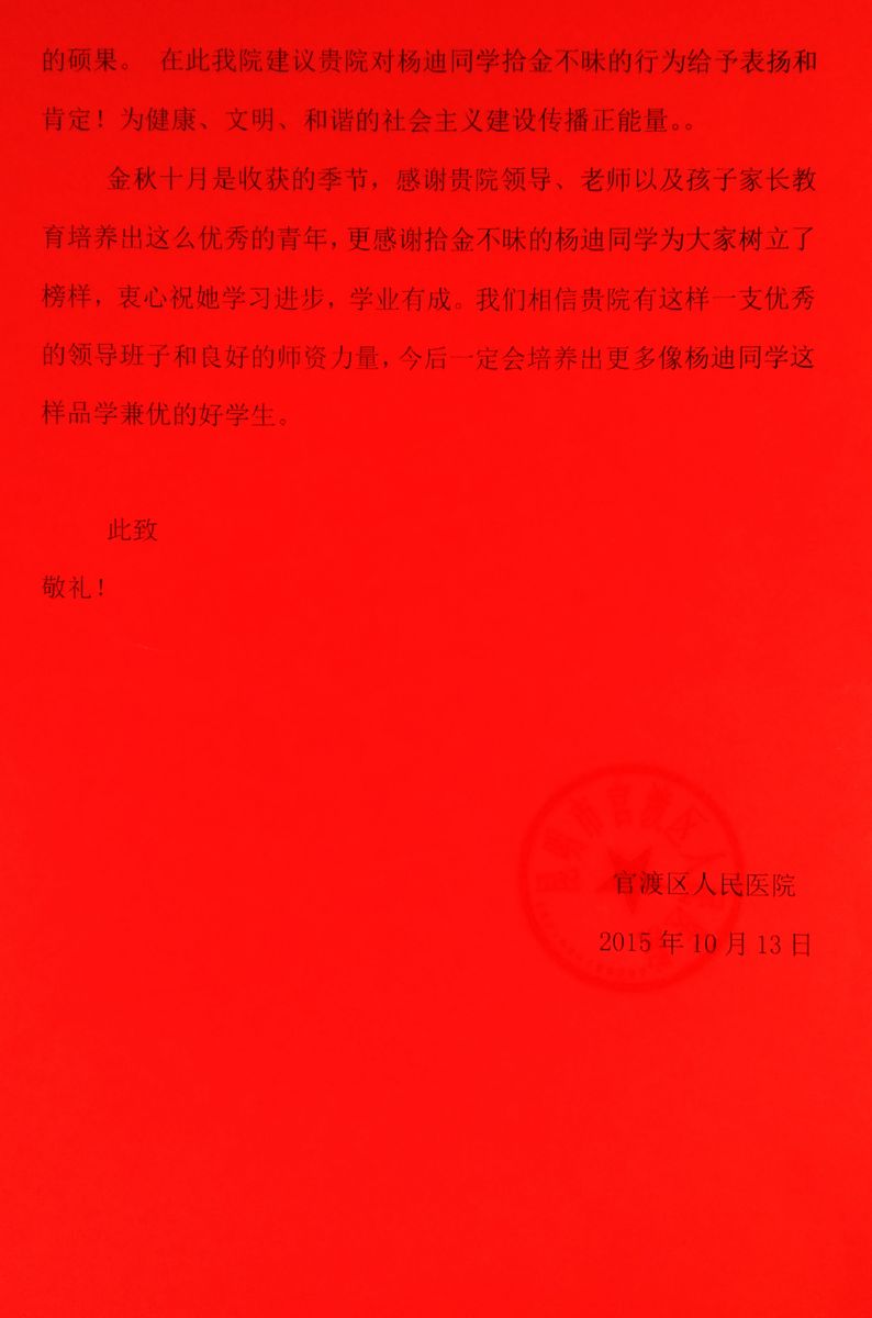 官渡区人民医院发来beat365实习生杨迪同学拾金不昧表扬信
