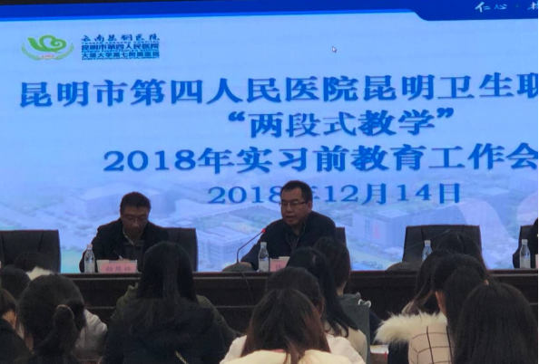 12月14日上午,beat365张尤松副院长,实习管理处颜慧林副处长,实习管理处纳适、郭嘉华老师一行4人,赴昆明市第四人民医院,对在医院进行“两段式教学”的学生,开展了实习前教育工作。