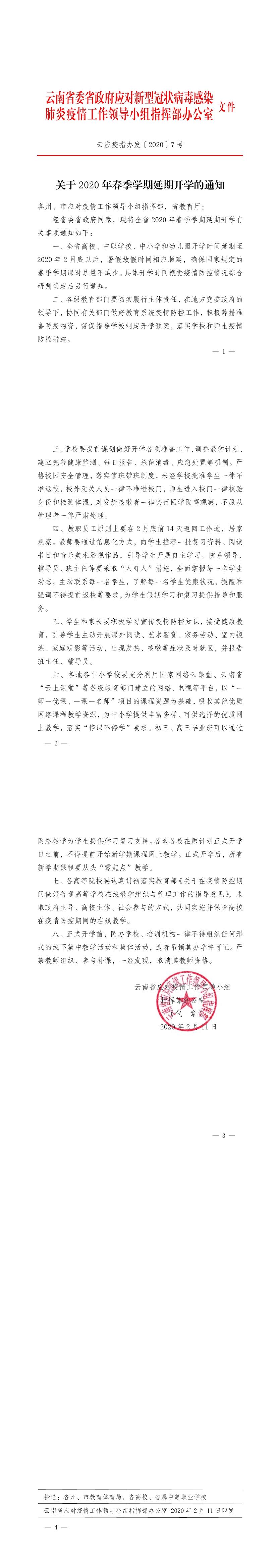 关于2020年春季学期延期开学的通知