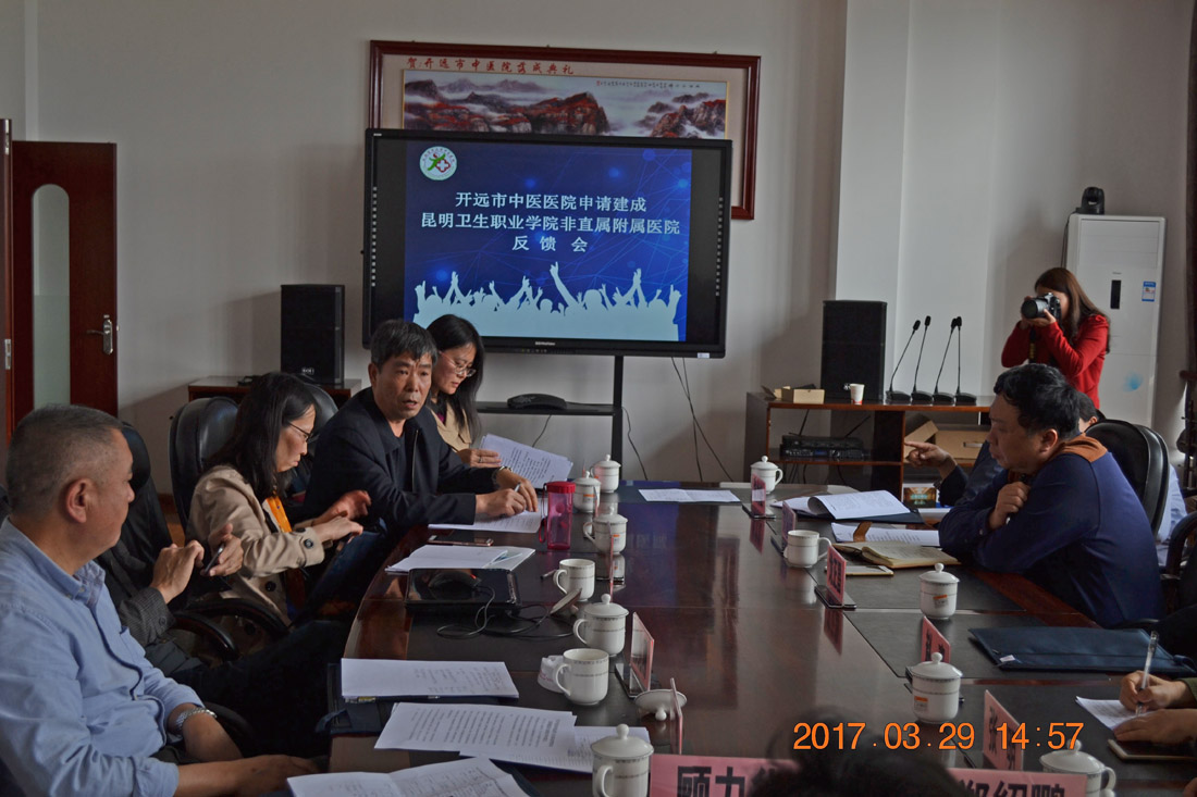 由云南省教育厅高教处谢怀昆副处长和云南省卫生计生委中医处代江玲率领的省专家组一行7人对开远市中医医院成为beat365平台官方网站非直属附属医院进行现场考察评审。出席评审工作汇报会的专家还有云南省中医医院朱虹江主任医师、昆明市中医医院顾力华副主任医师、云南中医学院郭兆刚教授、昆明学院医学院余珊教授、昆明理工大学医学院魏大巧主任,云南昆卫教育集团理事长、beat365平台官方网站党委书记、院长龙正昌,集团实习就业部部长张尤松、集团教学督导部部长赵春,开远市中医医院党委副书记、院长刘渝陵,开远市中医医院副院长张明,开远市中医医院副院长郑绍鹏,及开远市中医医院全体中层干部,各科教研室主任等出席此次验收工作。