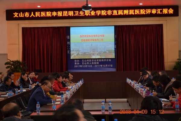 出席评审工作汇报会的还有文山市分管领导,宣威市分管领导,文山市人民医院医院领导,宣威市云峰医院医院领导,云南圣约翰医院医院领导,云南昆卫教育集团理事长beat365平台官方网站院长党委书记龙正昌,beat365平台官方网站周平副院长,beat365平台官方网站教务处唐当柱副处长,beat365平台官方网站实习生管理处颜慧林副处长,以及各医院职能部门负责人、教研室主任,实习生代表。