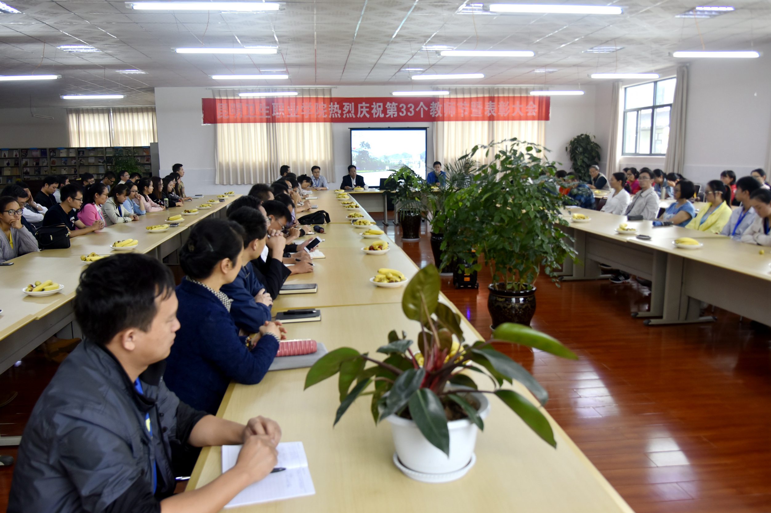 表彰活动结束,参会的教师分三个组,分别在图书馆二楼阅览室、行政楼五楼会议室、行政楼二楼会议室进行座谈。