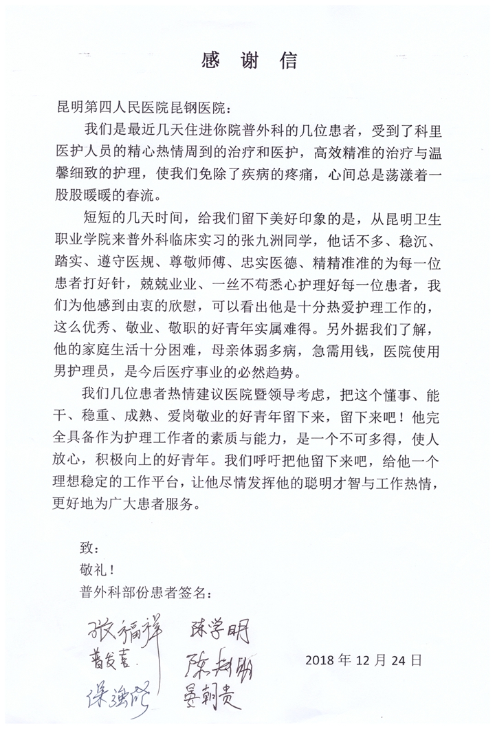 导语:医学也是人文科学,医生有了温度,医学也就彰显了温暖之本色。beat365护理专业张九洲同学在昆明市第四人民医院(昆钢医院)普外科因其实习工作突出,收到病人联名书写的感谢信和推荐信,他为学院实习生树立了良好的医者仁心的形象,展现了beat365学子扎实的医学技能和优良服务意识的风采。希望全院实习生向他学习,学习他树立服务意识、一切为了病人的服务理念,学习他甘于奉献、关爱病人的良好作风,以实际行动践行医学生誓言,为弘扬社会主义核心价值观献出自己的一份力量!