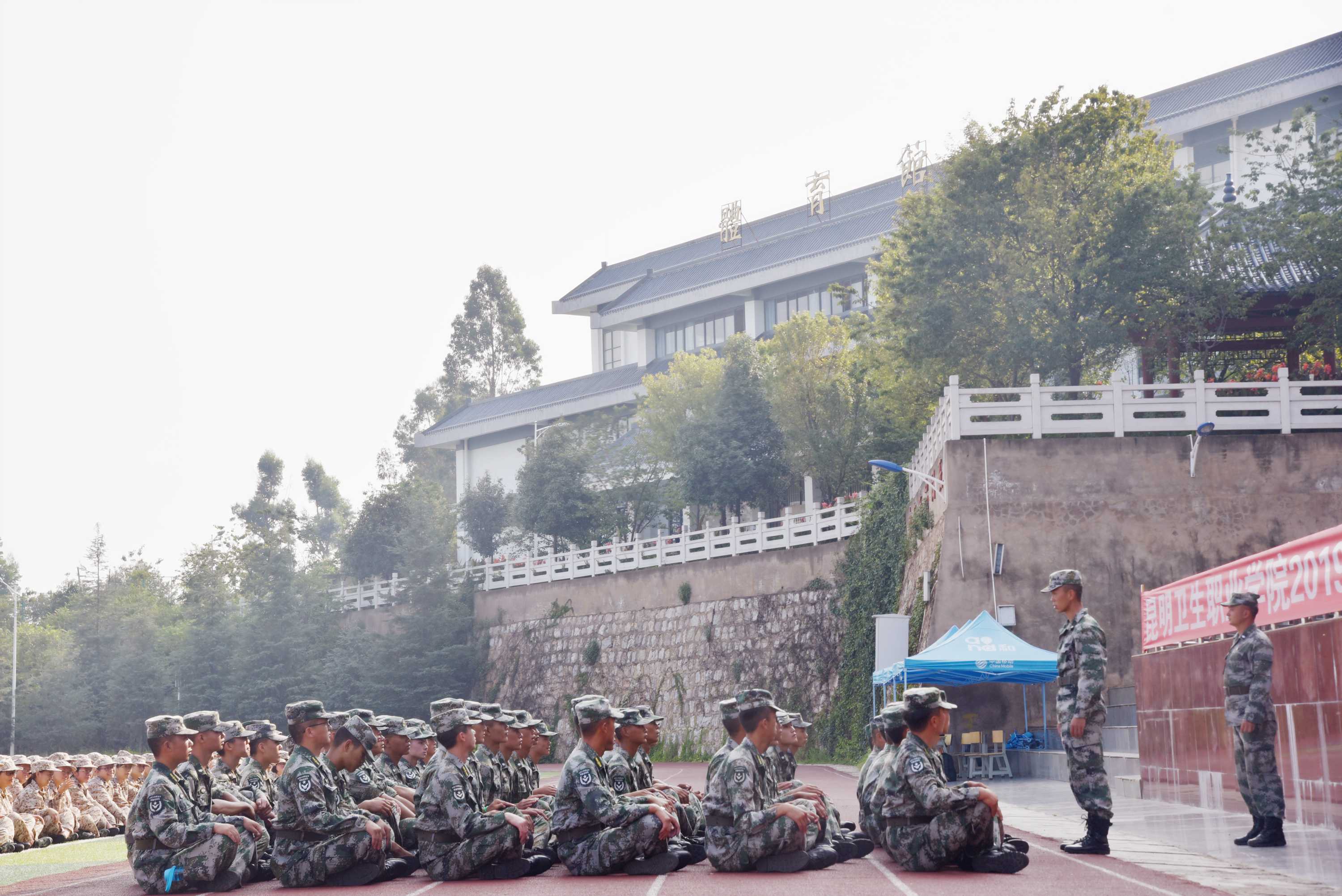 在全国上下隆重庆祝中华人民共和国成立70周年之际,为加强国防教育,增强青年学生的国防观念和国防素质,弘扬爱国主义精神,学院新生军训动员大会于2019年8月26日上午9:00分在学院足球场举行,标志着2019级新生军训工作进入军事技能训练阶段。云南昆卫教育集团理事长、学院党委书记龙正昌,院长贾勇、党委副书记张晓刚,党委委员、副院长周平,副院长龙雨霏、张磊、张尤松、陈举国,各职能处室负责人、二级学院院长及军训领导小组成员出席了大会。全体军训教官、军训干部及全院7000余名新生参加本次动员大会。大会由学院武装部部长高政南主持。