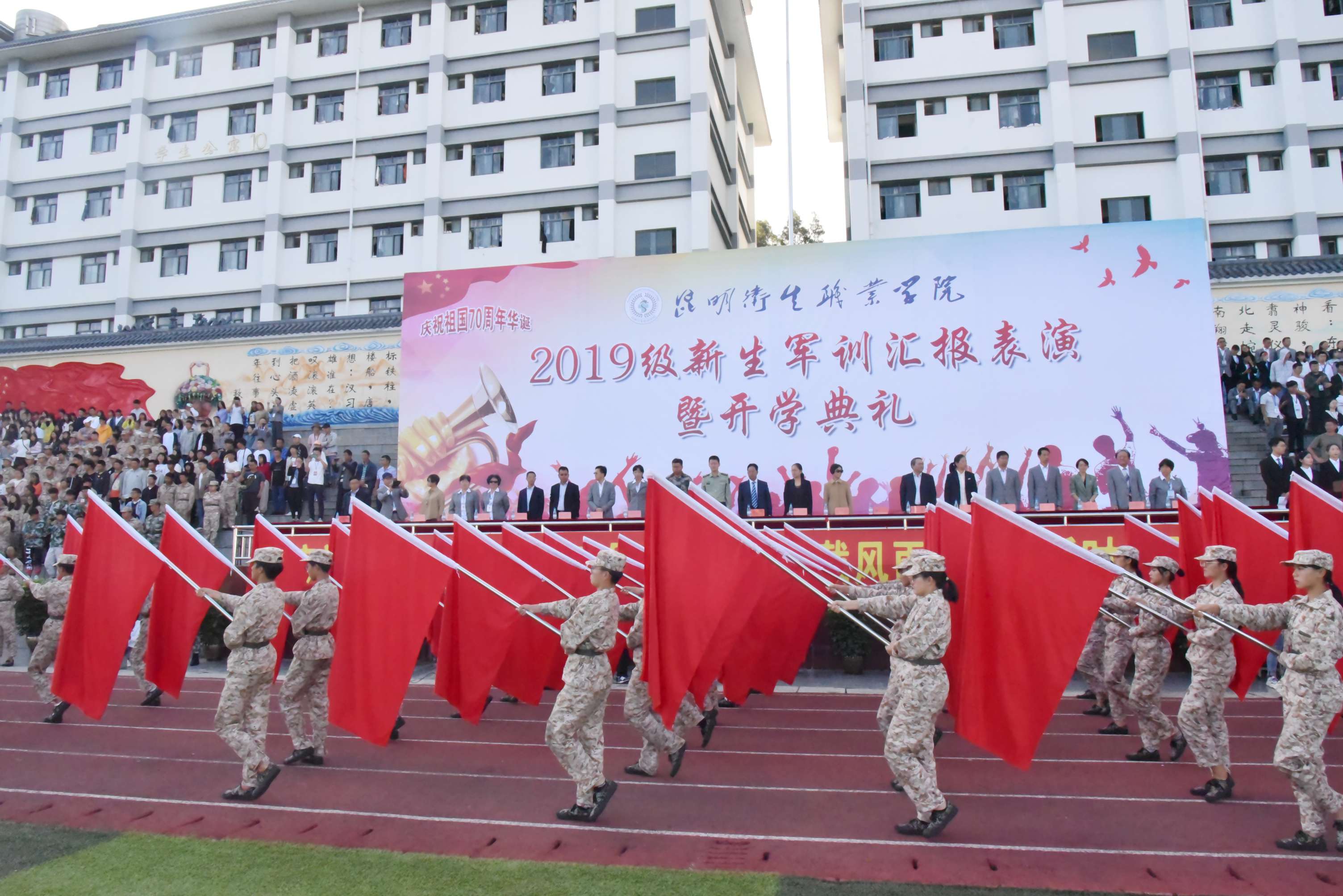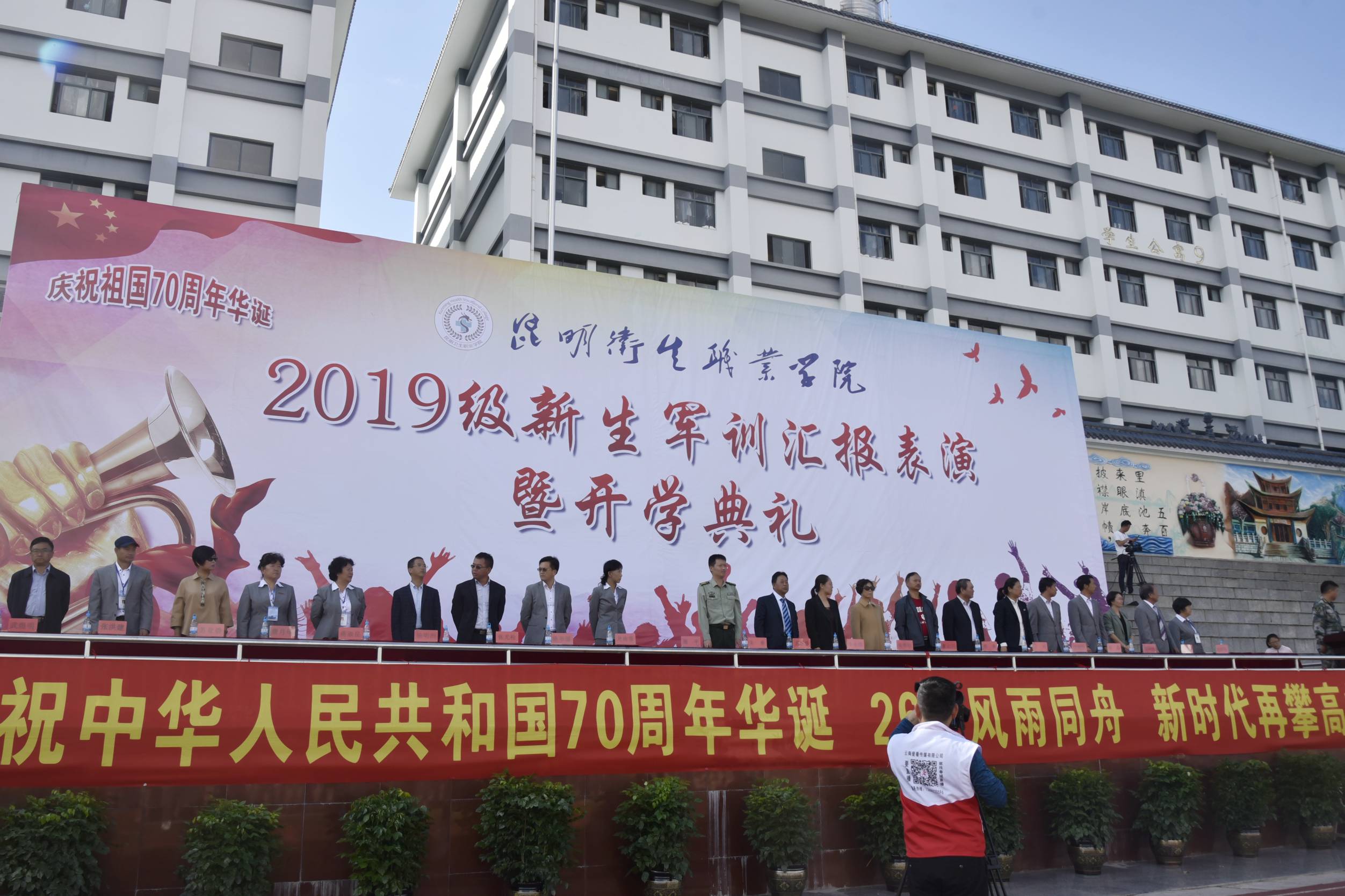 “教育报国守初心 、 立德树人担使命,青春强音琴瑟并起、 医学梦想此处起航”。9月7日上午,beat365平台官方网站2019级新生军训汇报表演暨开学典礼在学院足球场隆重举行。云南省教育厅职业教育与成人教育处副处长李永珺,昆明市晋宁区武装部政委朱勇,云南省高等教育学会秘书长、云南省高等教育评估中心常务副主任、云南大学博士生导师董云川教授等领导和嘉宾出席开学典礼。云南昆卫教育集团理事长、beat365平台官方网站党委书记龙正昌,云南昆卫教育集团副理事长朱秀珍,学院领导贾勇、张晓刚、龙雨霏、王玲、陶晓燕、杨明洲、周平、张磊、陈举国、张尤松出席大会,学院各二级学院院长、全体教职工及2019级全体新生、从昆明校区转入晋宁校区的2018级五年制学生参加开学典礼。