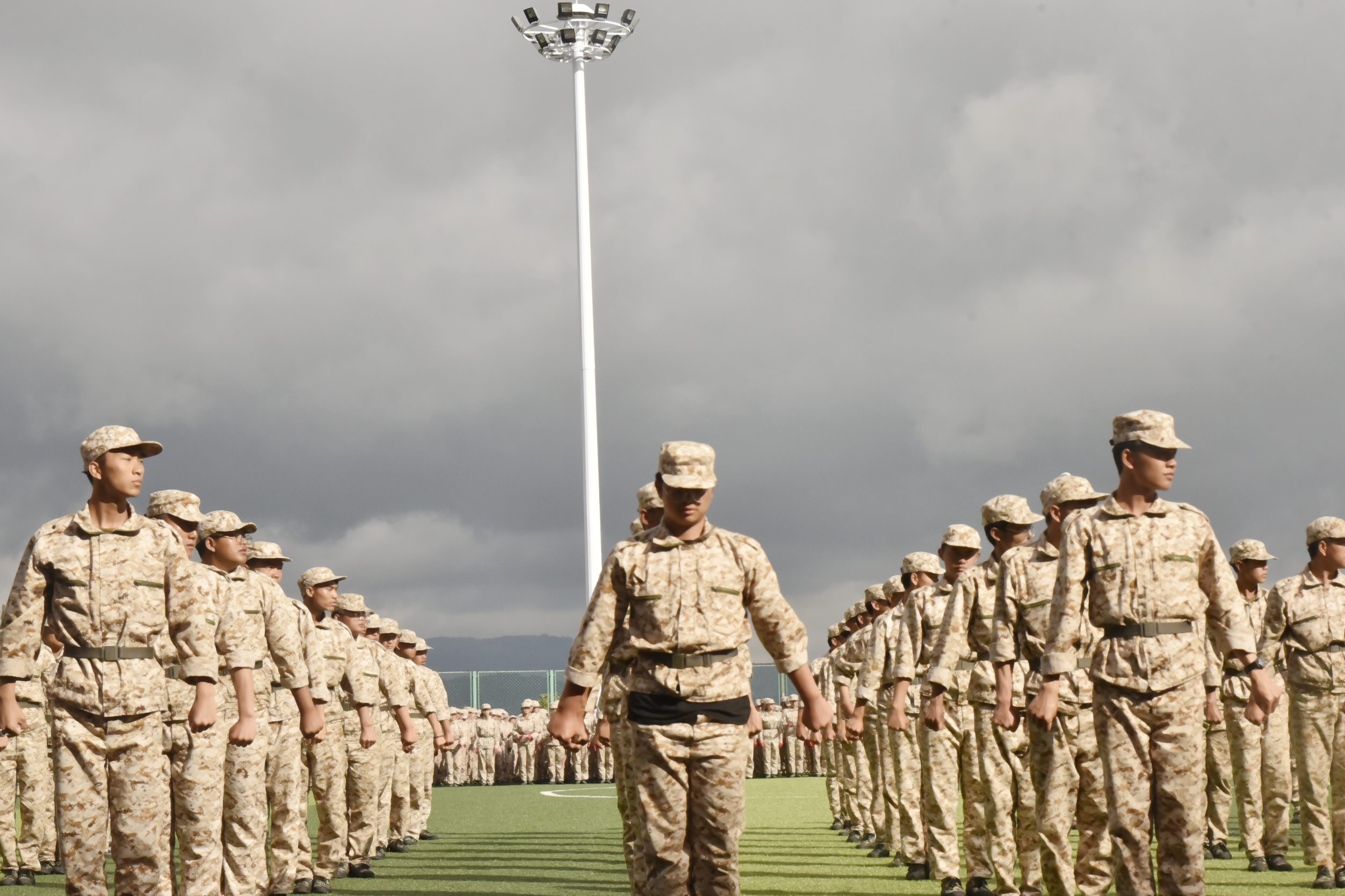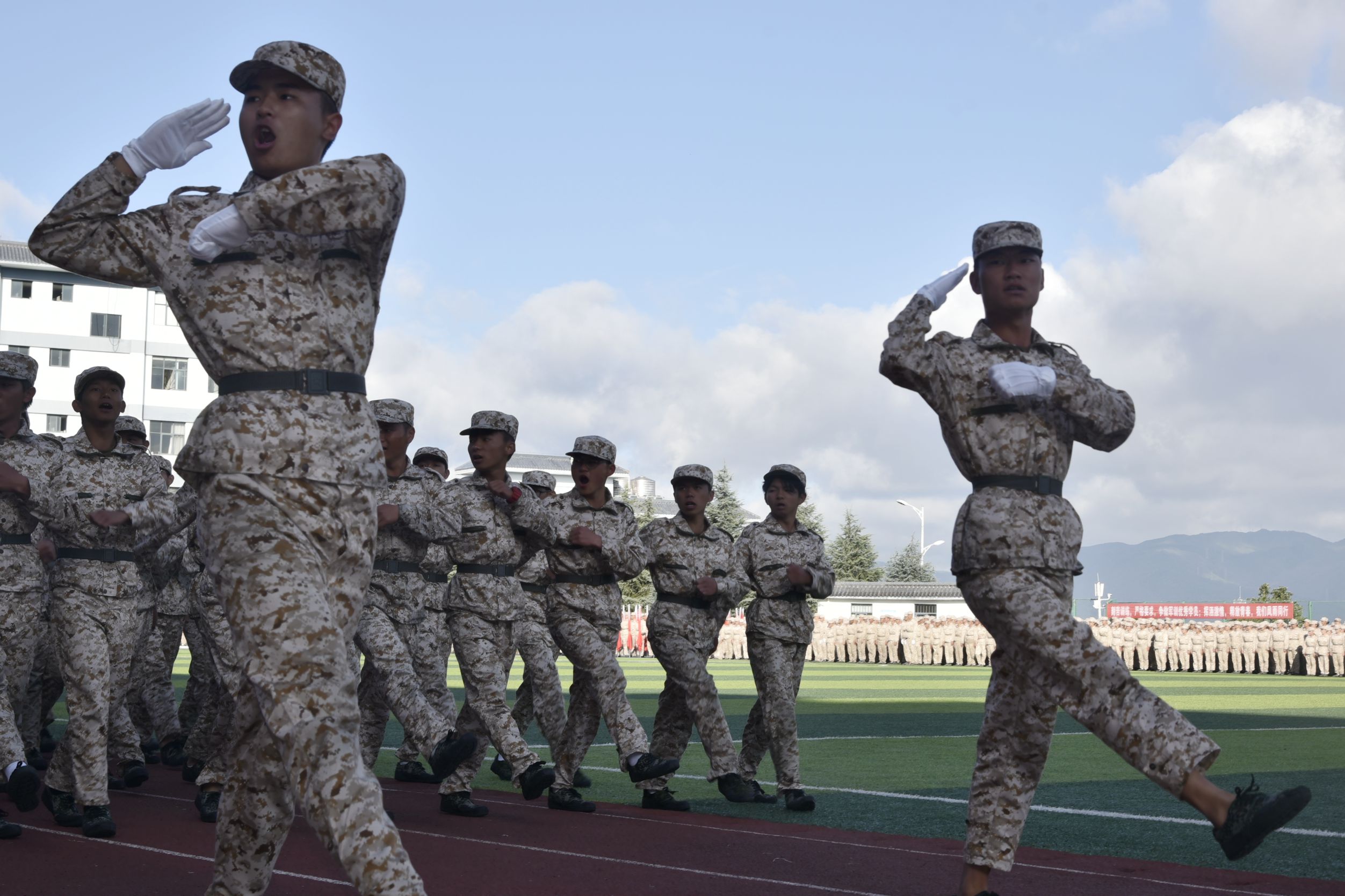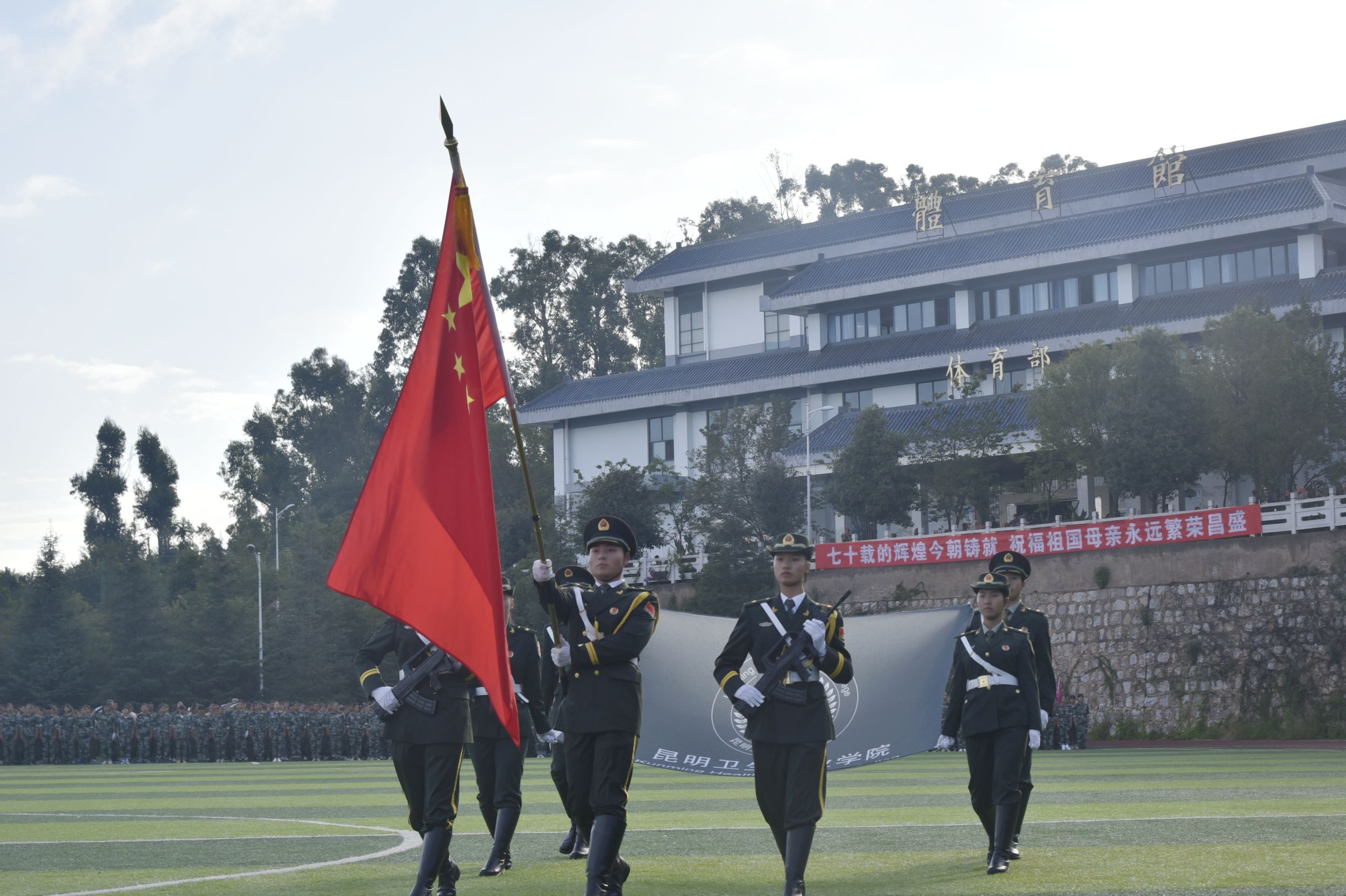 天高云阔,风语如歌。学院党委书记龙正昌在党委委员、副院长周平的陪同下检阅了新生军训方队。运动场上,2019级新生们口号洪亮,士气高昂,精神抖擞,充分展示了昆卫学子积极向上、拼搏进取的精神面貌。