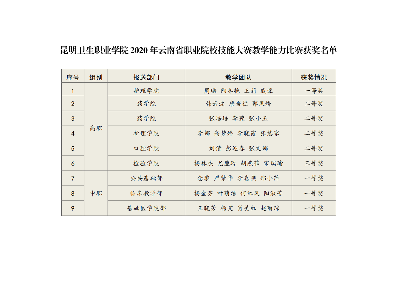 近日,云南省教育厅公布了2020年职业院校技能大赛教学能力比赛获奖名单。beat365平台官方网站推荐参赛的教学团队中,有9个教学团队脱颖而出,喜获佳绩——荣获一等奖4项、二等奖4项、三等奖1项。其中,中职组护理专业课程代表队杨金芬、叶萌洁、何红凤、阳淑芳四位老师,公共课程代表队念黎、严紫华、李嘉燕、郑小萍四位老师以较高的职业素养和职业技能获得了评委老师的一致好评,最终被推选进入全国教学能力比赛。