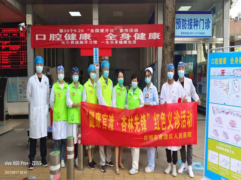 2021年9月20日全国爱牙日这天,四川攀钢集团总医院口腔科实习生,在医院门口准备了一系列例如牙膏,牙刷,牙线,义齿清洁片等赠送的小礼品,对进出的患者及家属宣讲口腔疾病预防,义齿清洁等相关口腔健康小常识,并且为有需求的患者做简单的口腔检查。