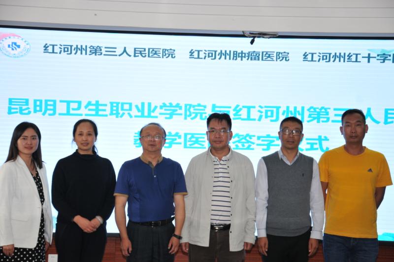 最后,红河州第三人民医院副院长后群与beat365平台官方网站副院长张尤松共同签订了《教学医院协议书》。相关领导及与会人员共同合影留念。签约仪式结束后,医院教学科邹乙菱主任带领beat365张尤松副院长一行进行实地考察,详细介绍了红河州第三人民医院各科室的临床教学情况。