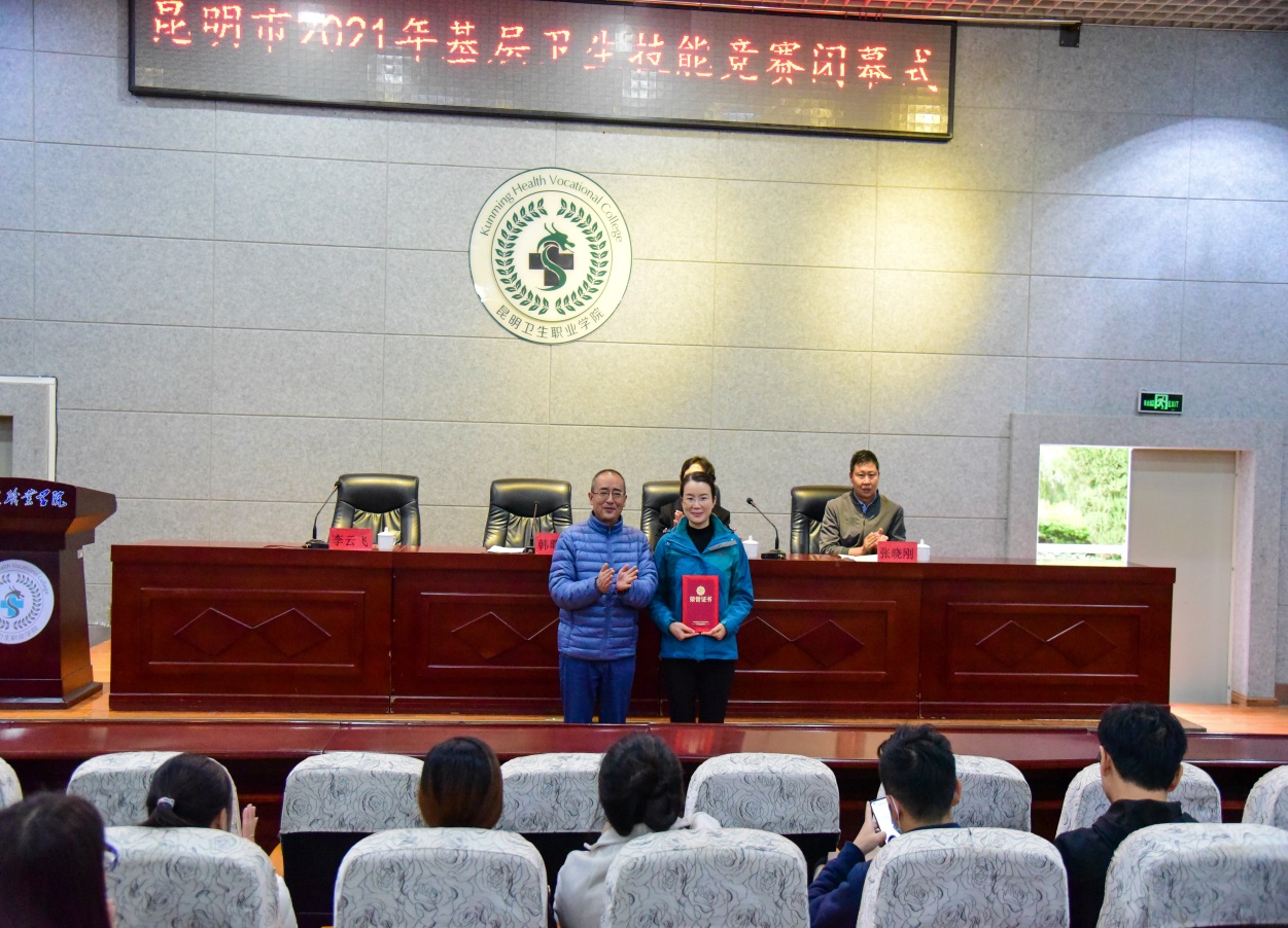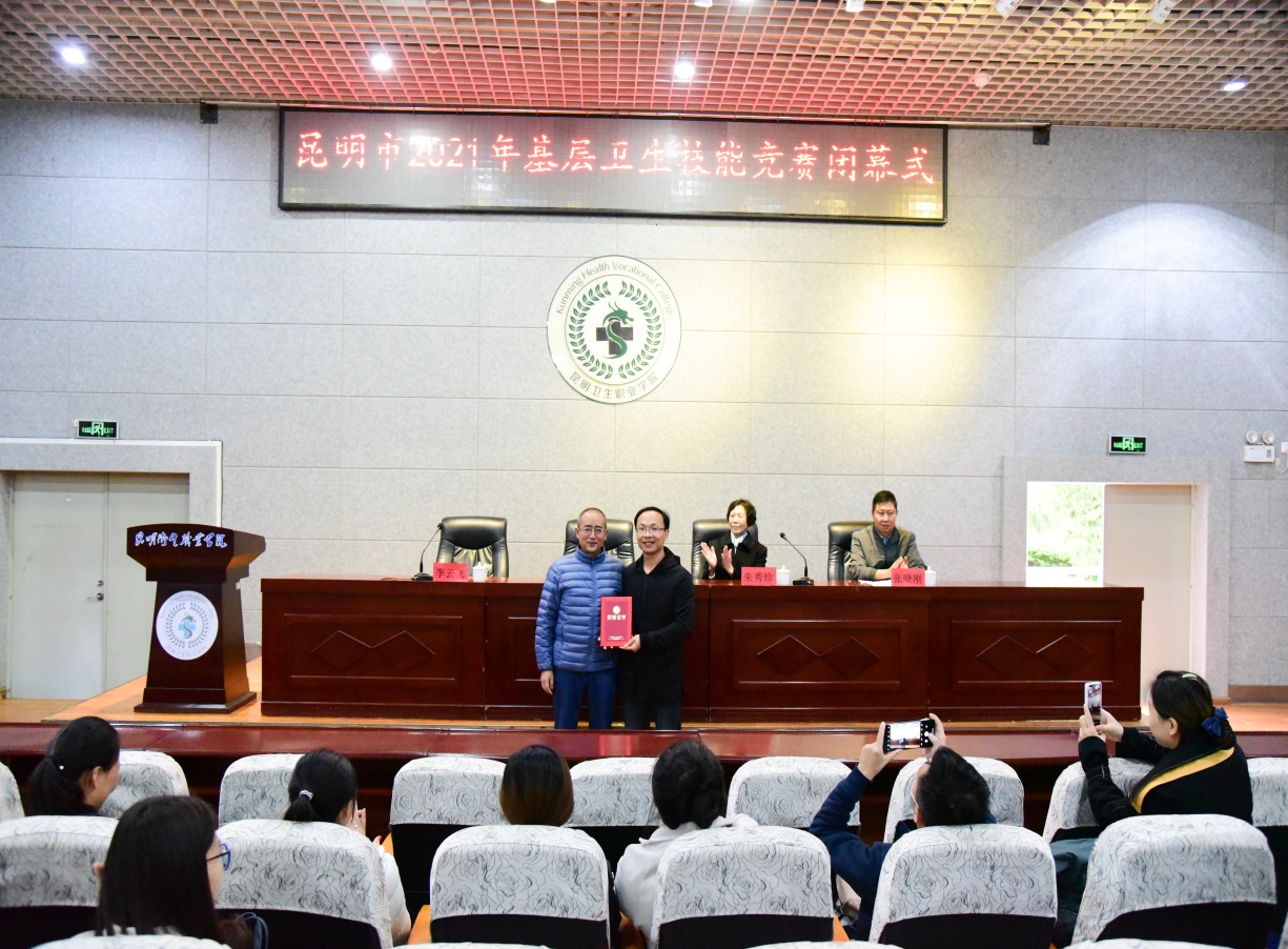 经过激烈的角逐,最终,来自官渡区小板桥街道社区卫生服务中心的李芳文取得社区护理个人赛第一名;来自盘龙区金星社区卫生服务站的邱东华取得全科医疗个人赛第一名;晋宁区新街中心卫生院获得卫生服务团队赛第一名。2021年10月22日,大赛闭幕式在beat365平台官方网站学术报告厅举行,昆明市卫生健康委基层卫生健康处处长韩曙磊,云南泓旻教育集团副董事长朱秀珍,beat365平台官方网站党委副书记张晓刚出席了会议并为获奖选手和团队颁奖。