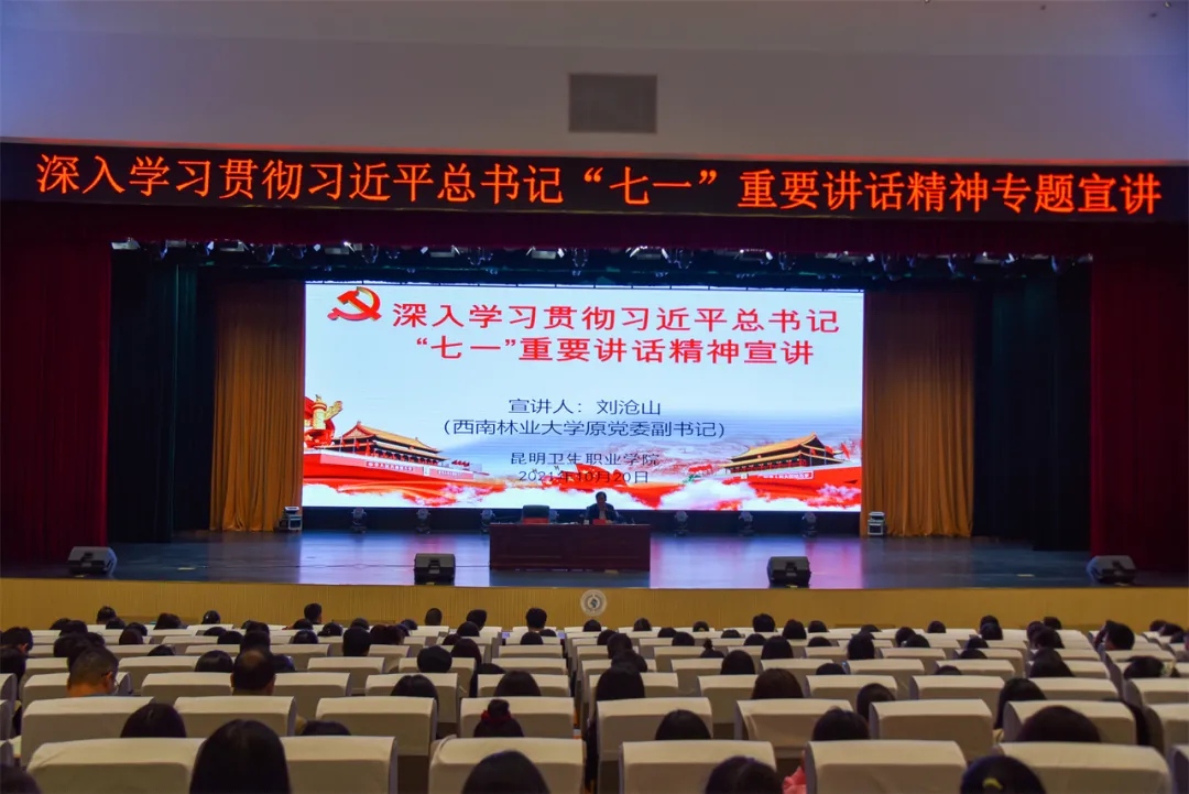 刘沧山教授围绕党的十九大的主要成果、中国共产党的四大丰功伟绩、正确认识和把握两个大局、立足云南扎根红土高原贡献力量、为实现中华民族伟大复兴贡献智慧和力量五个方面,追忆了中国共产党在泥泞中起步、在曲折中发展的峥嵘岁月,阐述了百年征程书写的波澜壮阔画卷,歌颂了我们党领导人民取得的举世瞩目的辉煌成就,解读了如何把握在百年征程中形成的伟大建党精神的要义,勉励昆卫师生在党史学习中汲取奋进力量,提高六大素质,增强两大能力,为实现第二个百年目标贡献智慧和力量。