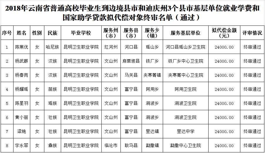 经审核并公示无异议,对《云南省教育厅关于公布2018年云南省普通高校毕业生到边境县市和迪庆州3个县市基层单位就业学费和国家助学贷款代偿终审结果的通知》中beat3658名通过终审毕业生予以公布。