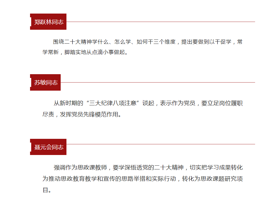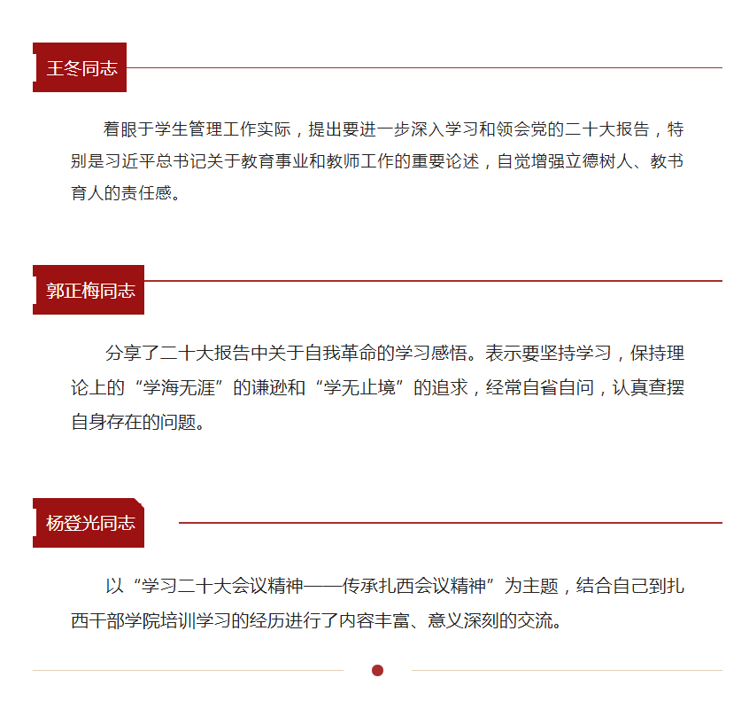 11月29日,马克思主义学院党支部组织开展二十大精神学习成果交流分享会,支部党员围绕党的二十大报告,结合自身岗位及生活实际开展了热烈的讨论交流。