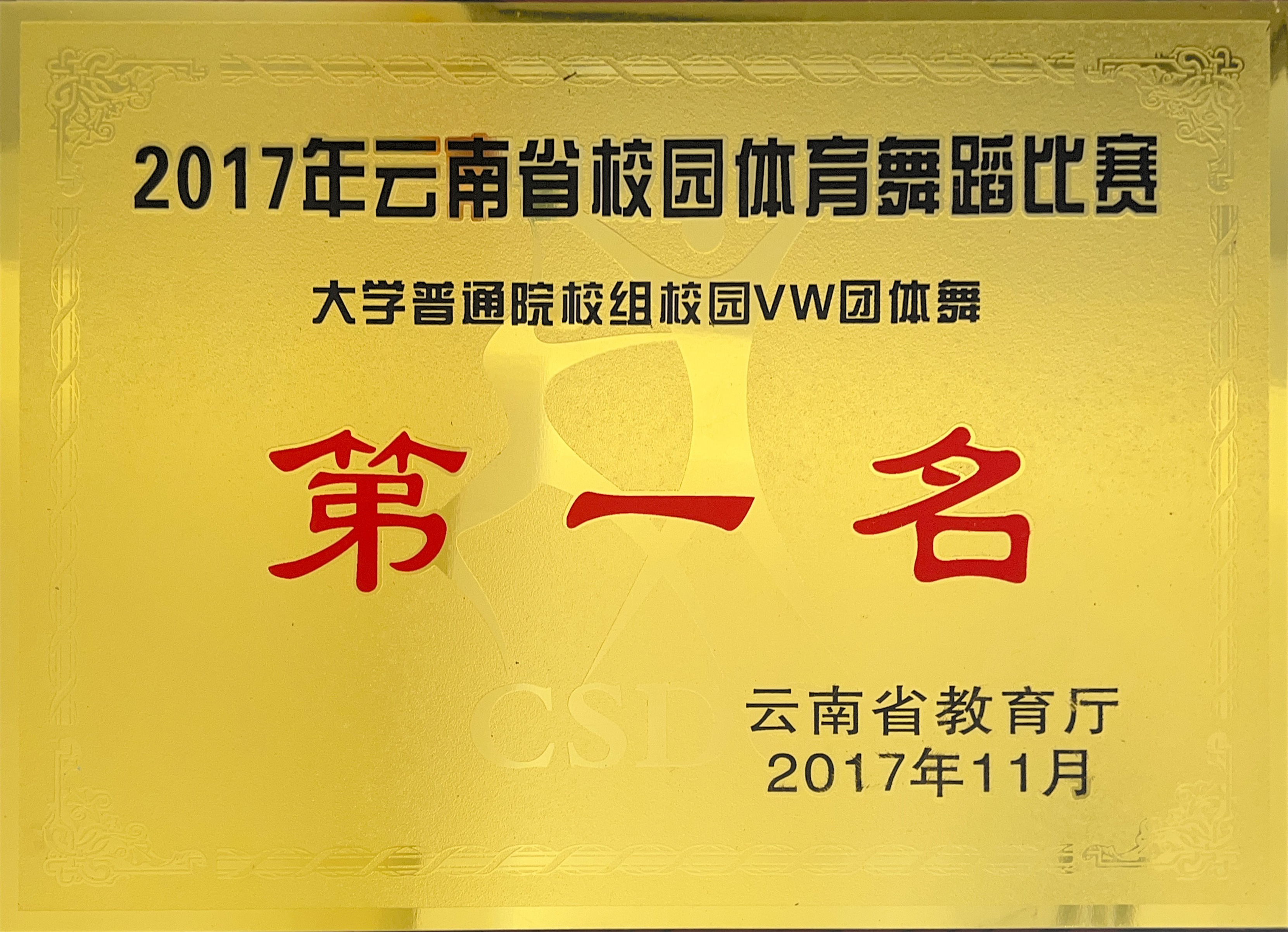 2017年云南省校园体育舞蹈比赛大学普通院校组中,校园V W团体舞和校园C团体舞分别取得第一名的优异成绩。
