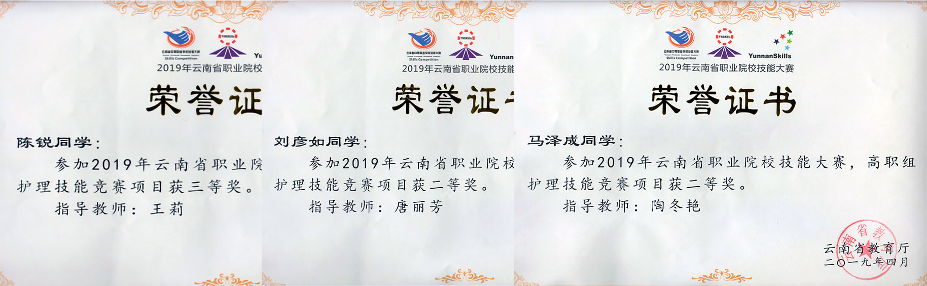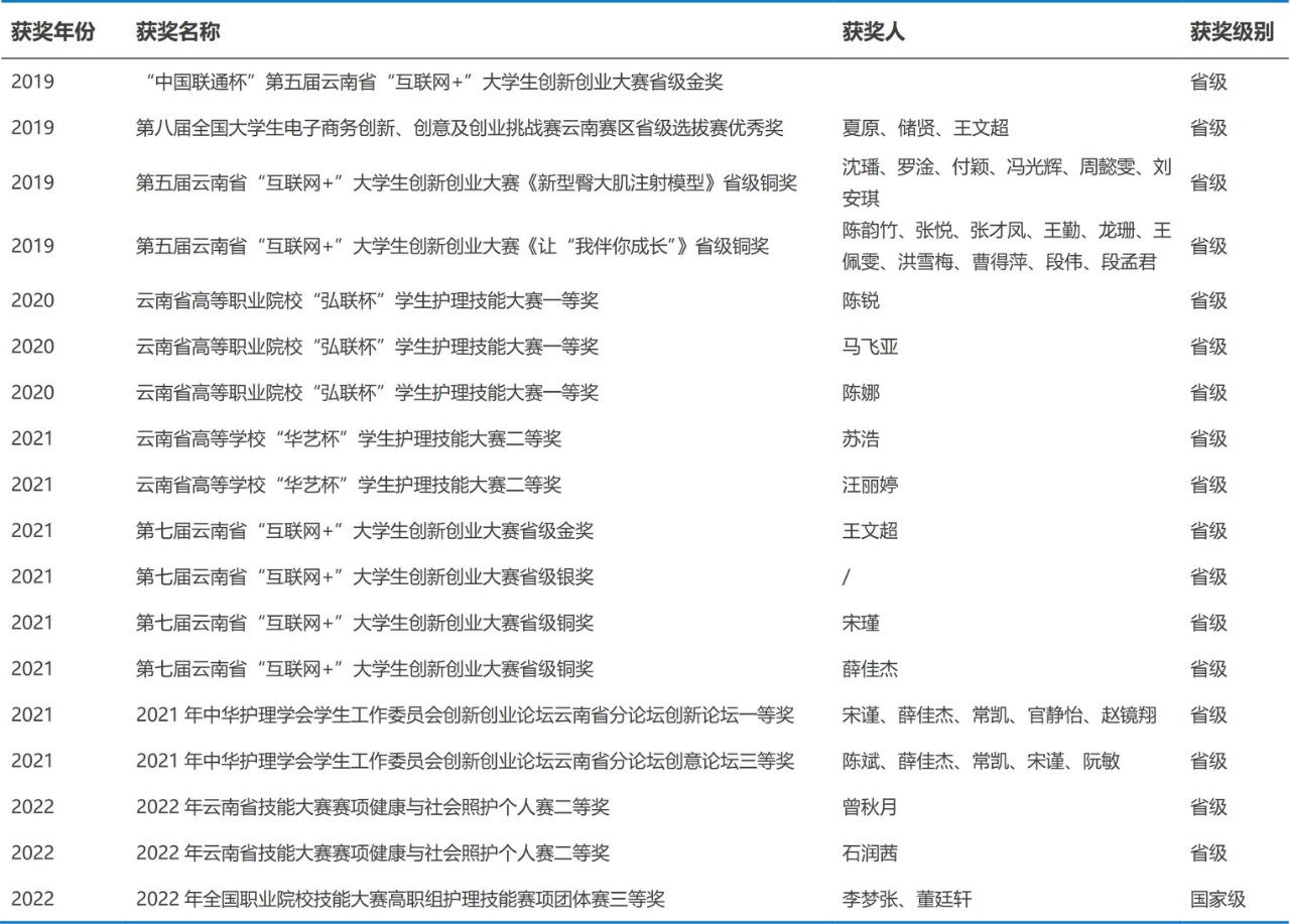 近五年来护理学院高度重视师生培养,积极鼓励广大师生参加大赛,秉承以赛促学、以赛促教的教学原则,一是以比赛为契机,加大对教师的培训力度,提高对教师的教学要求,不断提升自身素养,吸收新的教学理念,学习新的专业知识,向复合型教师转变。二是巩固学生的专业技能,激发学生学习热情,培养高素质技术技能专门人才,为学生就业打下坚实基础,多次荣获省级及国家级奖项。