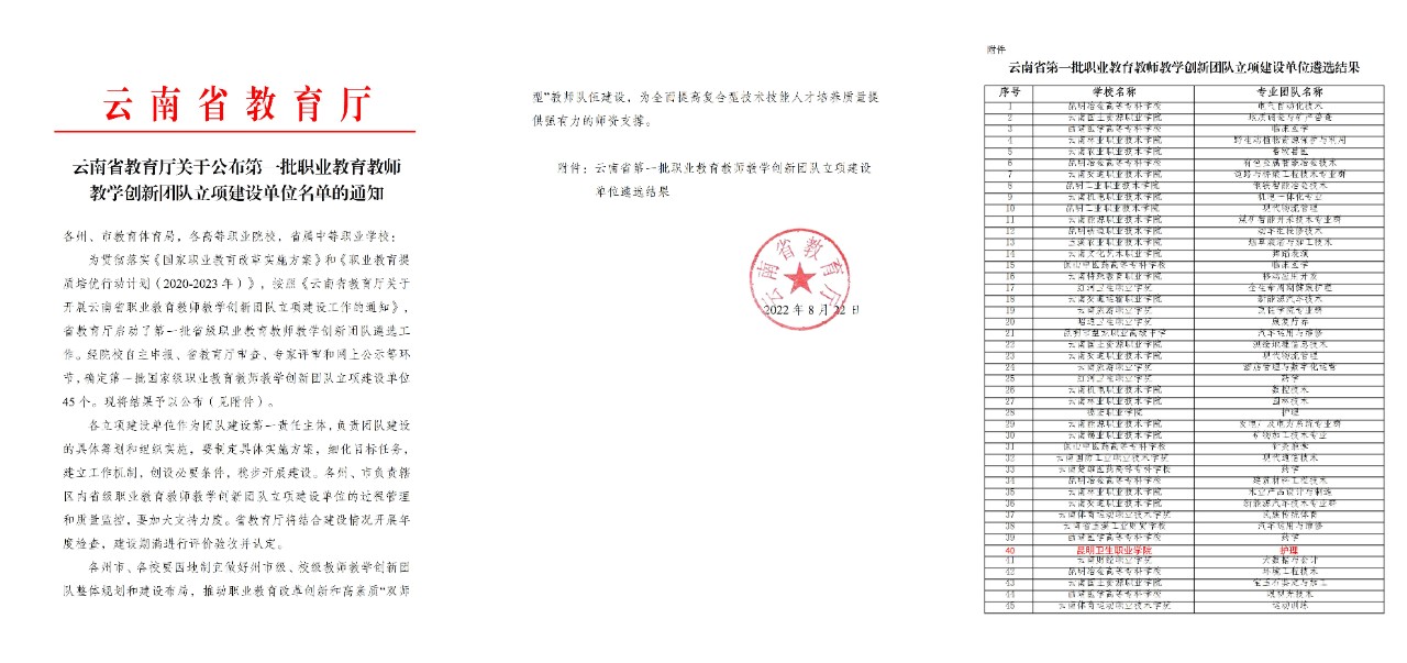 近年来护理学院高度重视教师队伍建设,旨在全面综合发展提升教师能力,并荣获教学创新团队。教师教学创新团队建设是教师队伍建设的核心,又是提升教师队伍建设质量的关键。2022年云南省高水平护理专业群成功立项,同时获批云南省第一批职业教育教学创新团队。