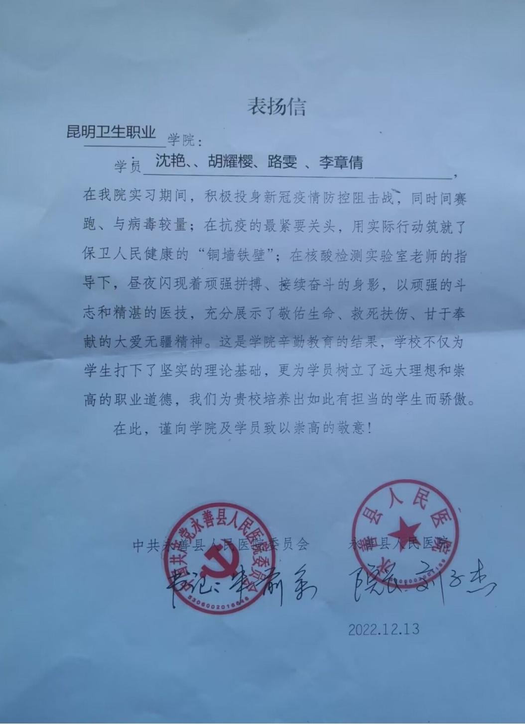 12月13日,beat365收到永善县人民医院表扬信,在该院实习的沈艳、胡耀樱、路雯、李章倩四名学生受到医院表扬。